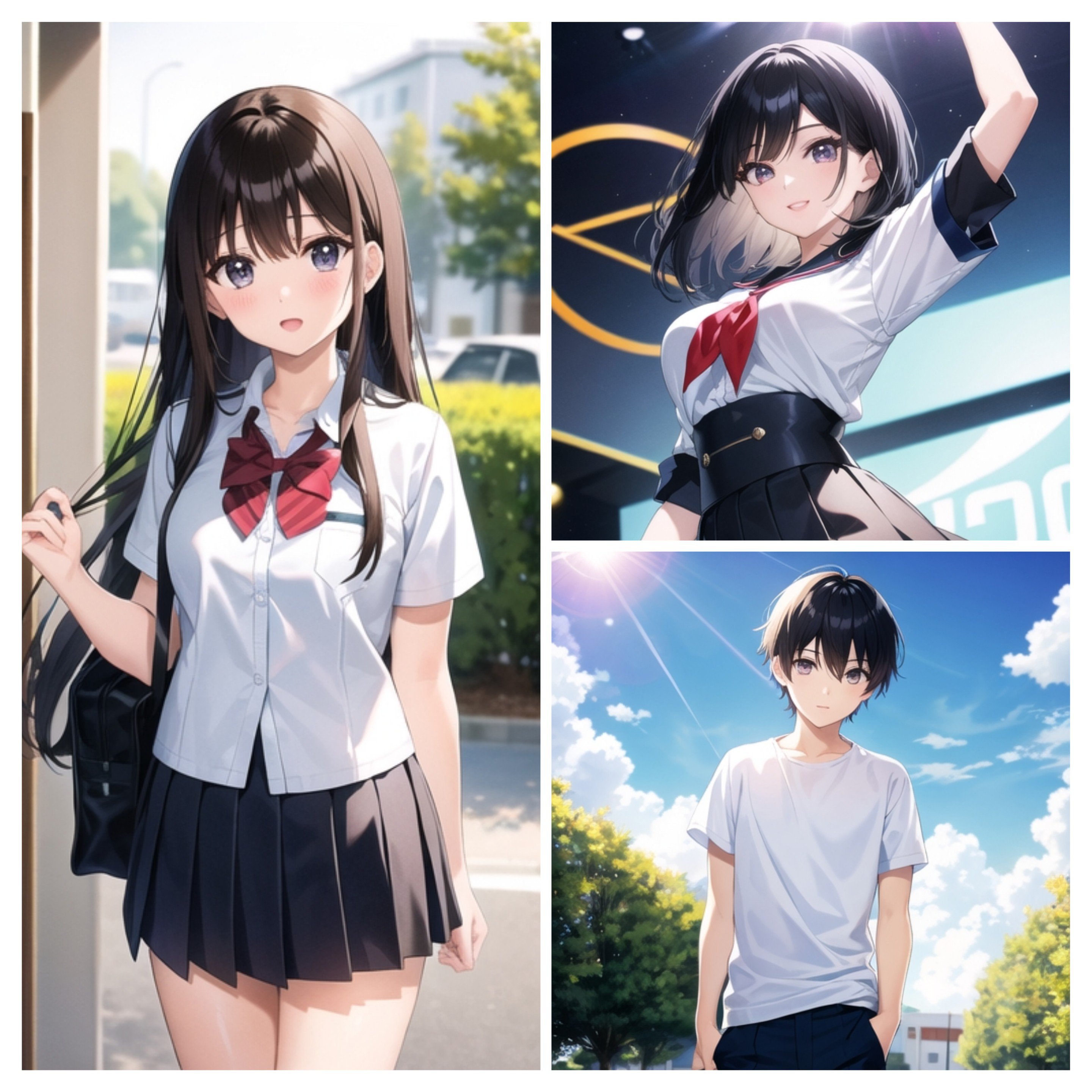 右上お姉さんの方は背景が少しおかしくなってしまいましたけど、この辺をAIに注文するのは難しいです(-∀-`; )