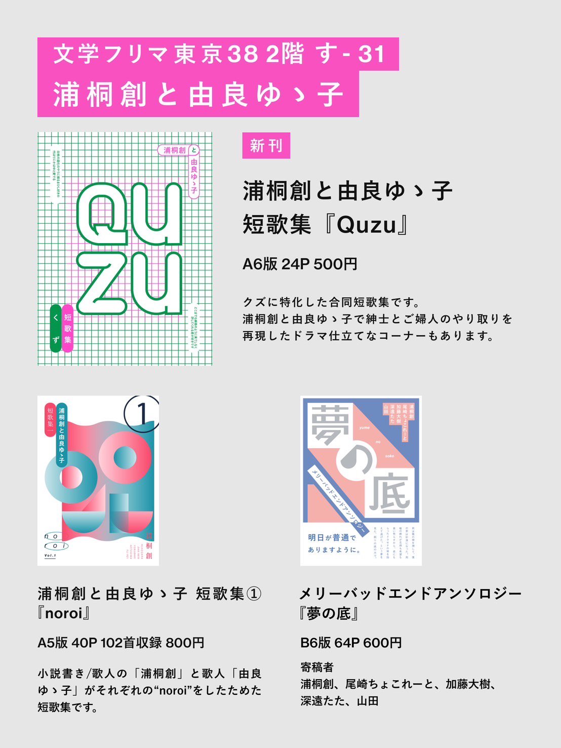 5/19(日)文学フリマ東京38(第二展示場二階 す-31)に、短歌ユニット「浦桐創と由良ゆゝ子」』にて出展します!