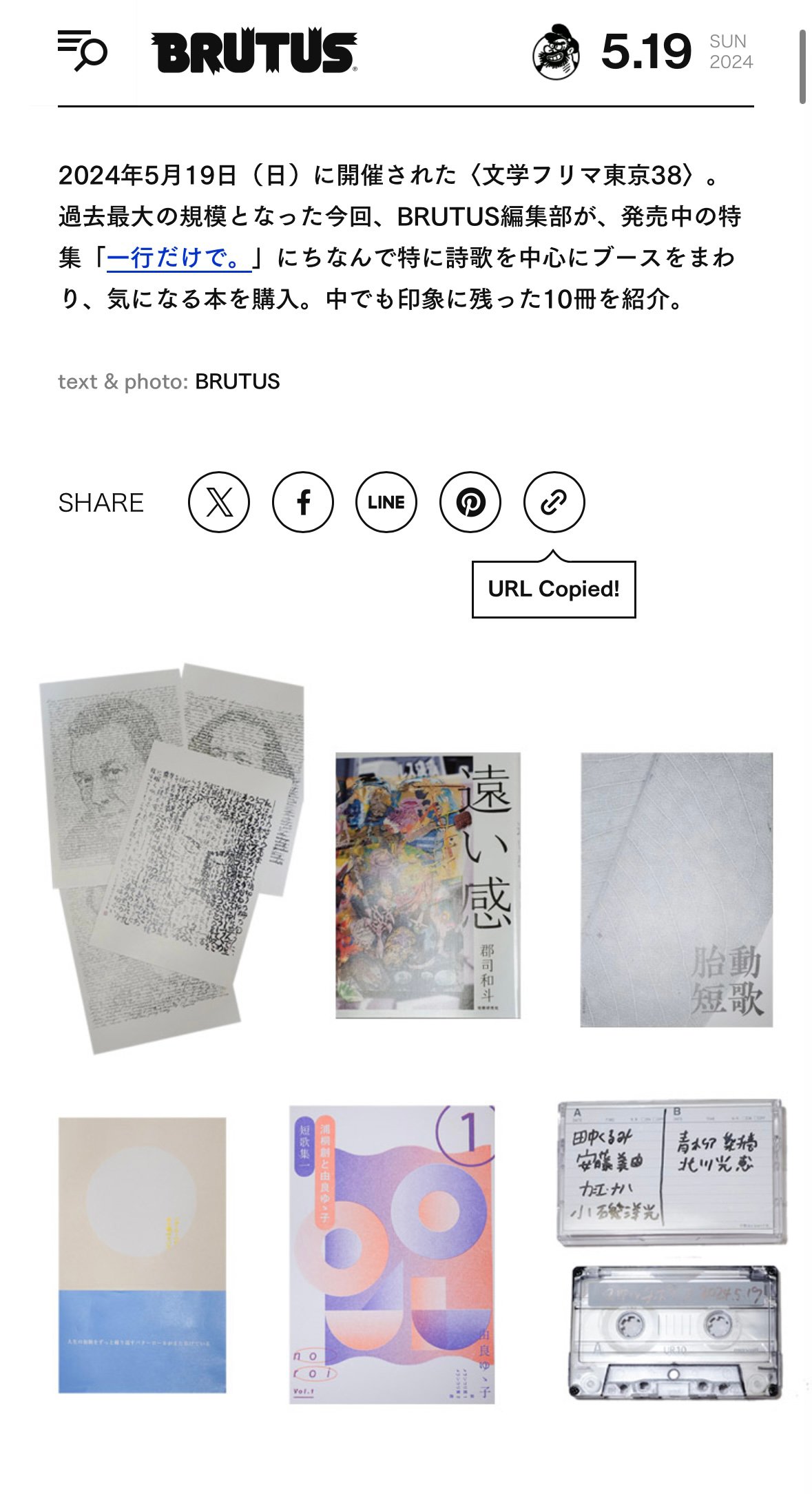 そして今回! 憧れのハイパーおしゃれポップ・カルチャー総合誌であり、ライフスタイル情報誌でもある(とワイは解釈している)『BRUTUS』様のWebメディアに、我々の第一合同短歌集『noroi』を掲載いただきました!! 嬉しい! 夢だけど、夢じゃなかった! 嬉しすぎて、アドレナリン超出た。興奮して夜しか眠れない。