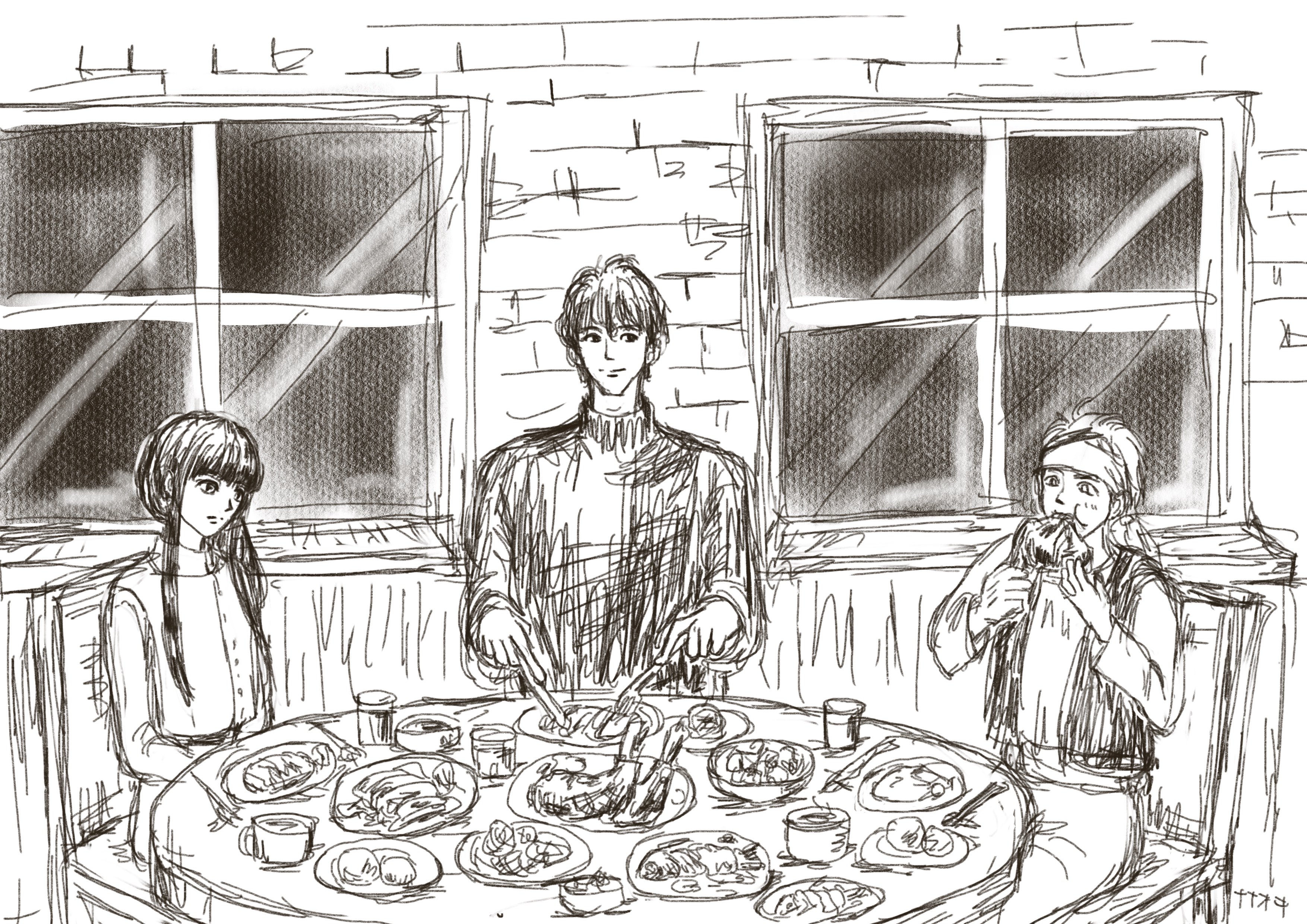 テーブルの上のそれっぽい感じの料理描くのが楽しい。