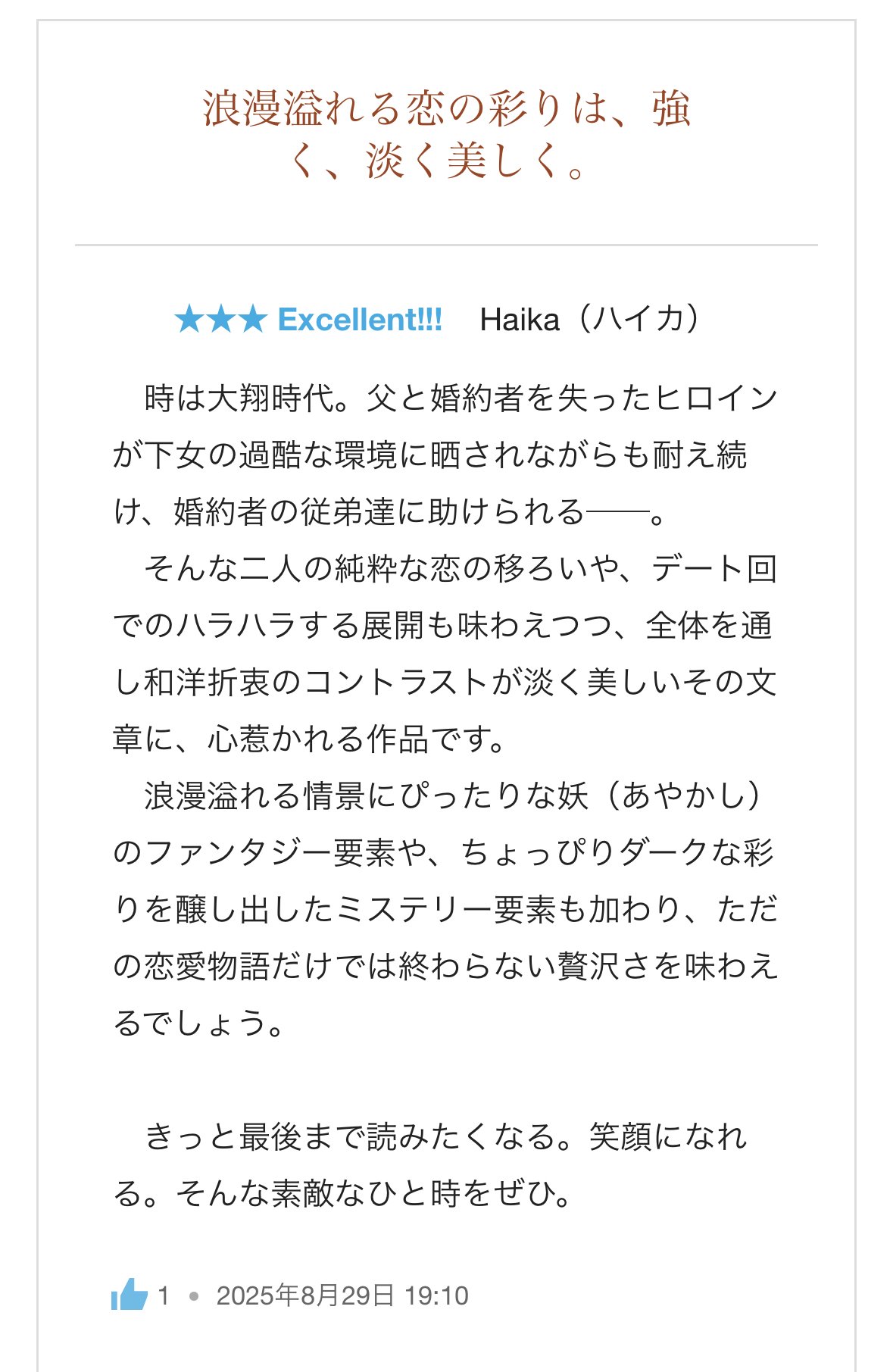 Haika(ハイカ)様から『すずめの涙~笑顔を忘れた不遇令嬢は、妖狐使いの軍医に盲愛される~』