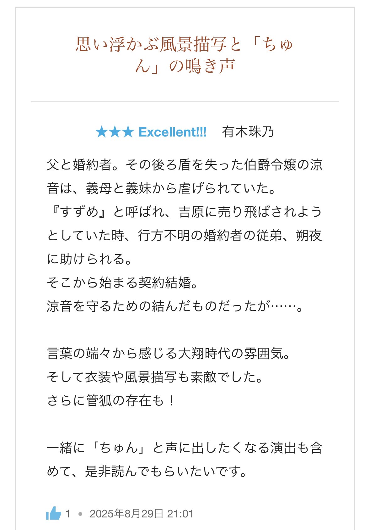 有木珠乃様から『すずめの涙~笑顔を忘れた不遇令嬢は、妖狐使いの軍医に盲愛される~』