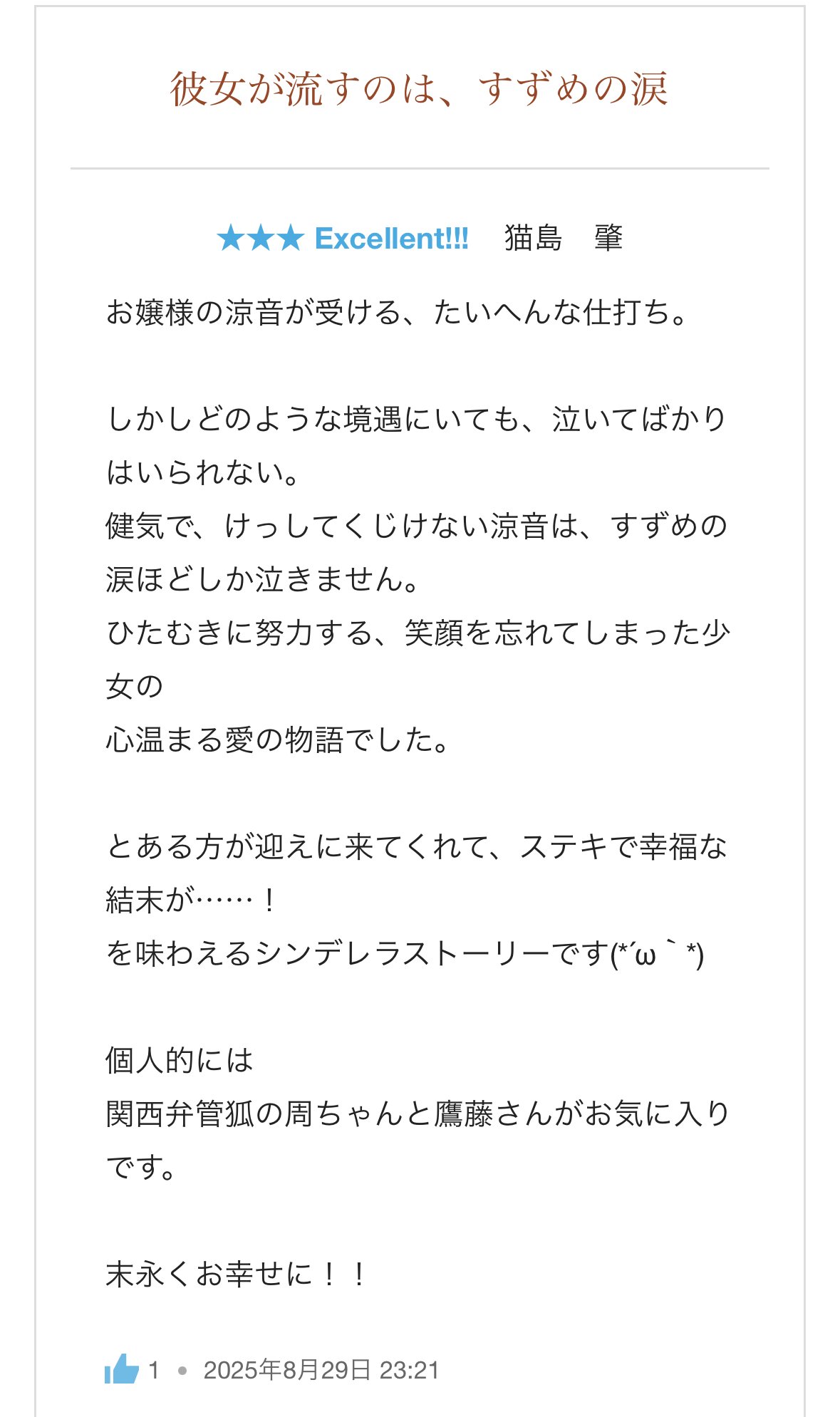 猫島 肇様から『すずめの涙~笑顔を忘れた不遇令嬢は、妖狐使いの軍医に盲愛される~』