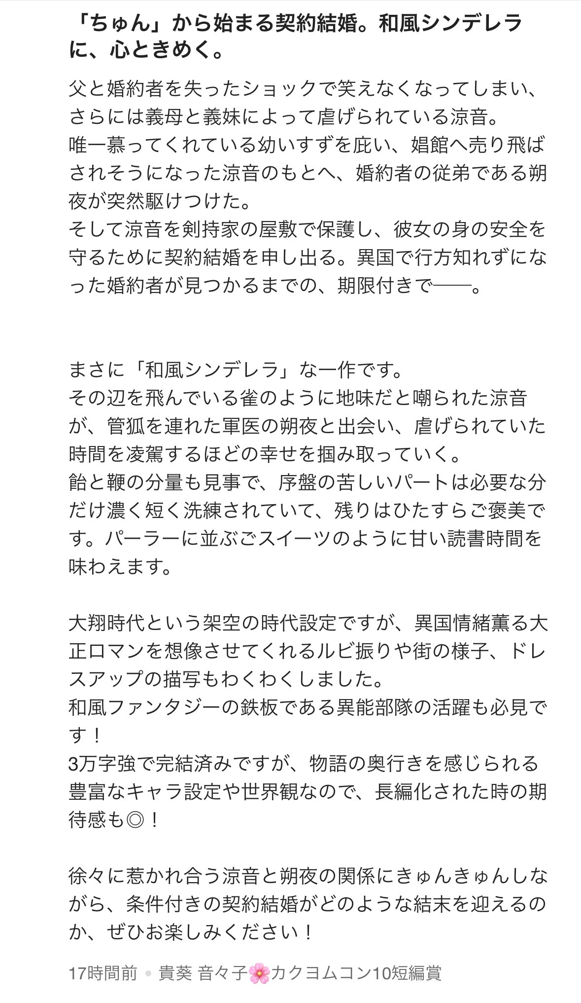 貴葵 音々子様から『すずめの涙~笑顔を忘れた不遇令嬢は、妖狐使いの軍医に盲愛される~』