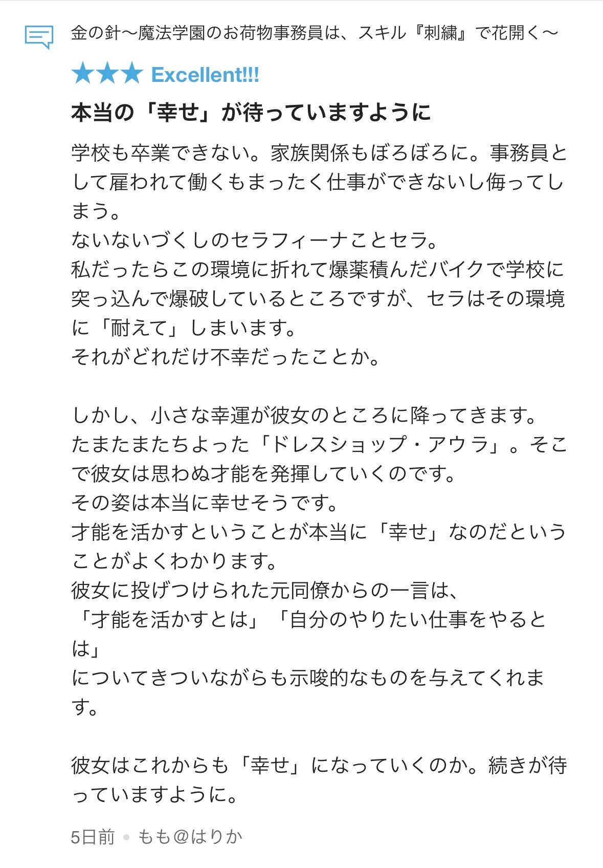 もも@はりか様から『金の針~魔法学園のお荷物事務員は、『スキル刺繍』で花開く~』