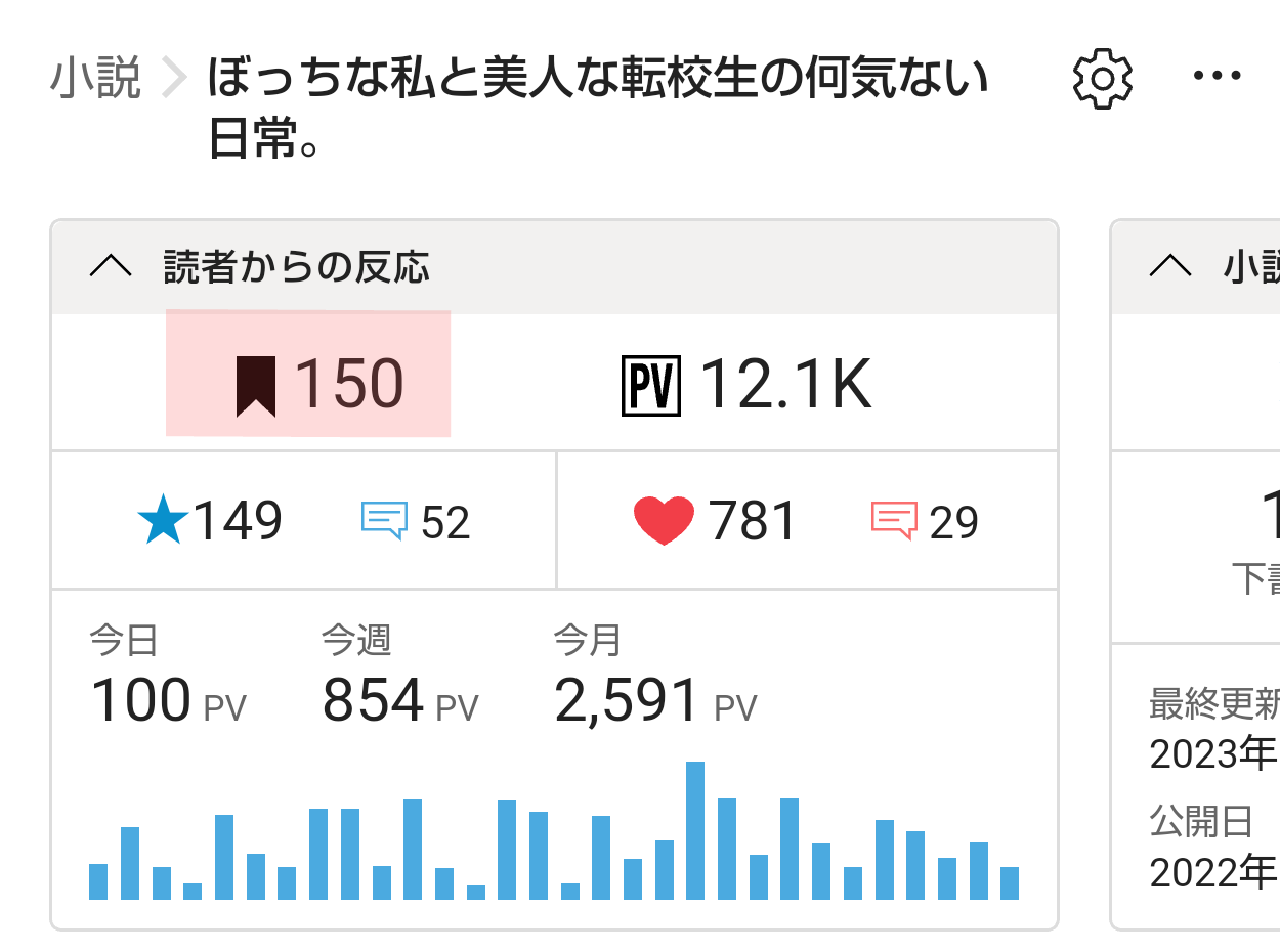 『ぼっちな私と美人な転校生の何気ない日常。』(軽めの百合小説)作品のフォロワー数が150に到達しました。フォローしてくださった方ありがとうございます。星の方は後一つ。今週中には到達したいな。