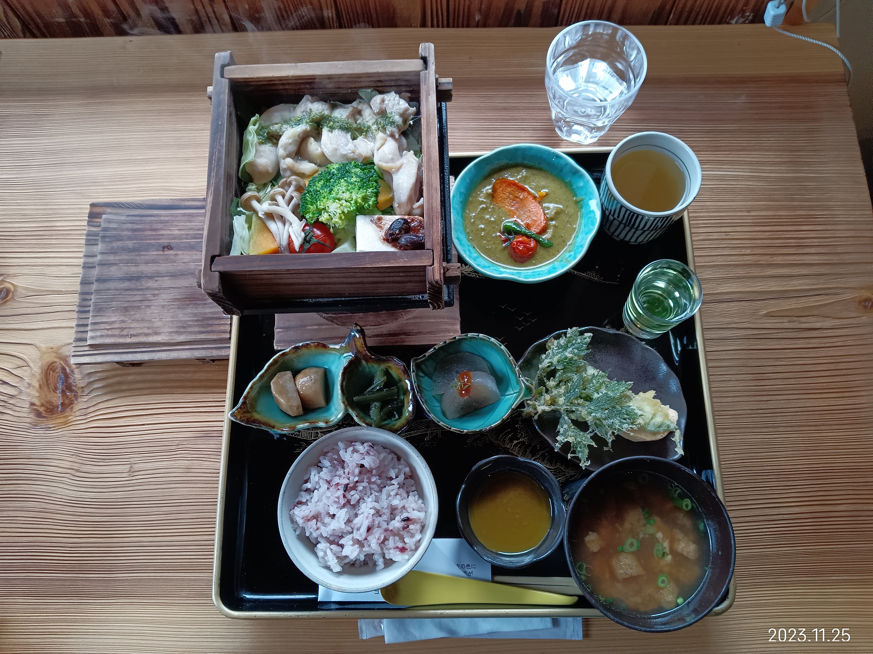 前回は薬草カレーを注文しましたが、今回はせいろ蒸しのセットを食べました。煮物に玉こんにゃく、天ぷらに玉子焼き……、それから少量の薬草カレーとブレンド薬草茶までついてくる、豪華なランチでした(≧∇≦)