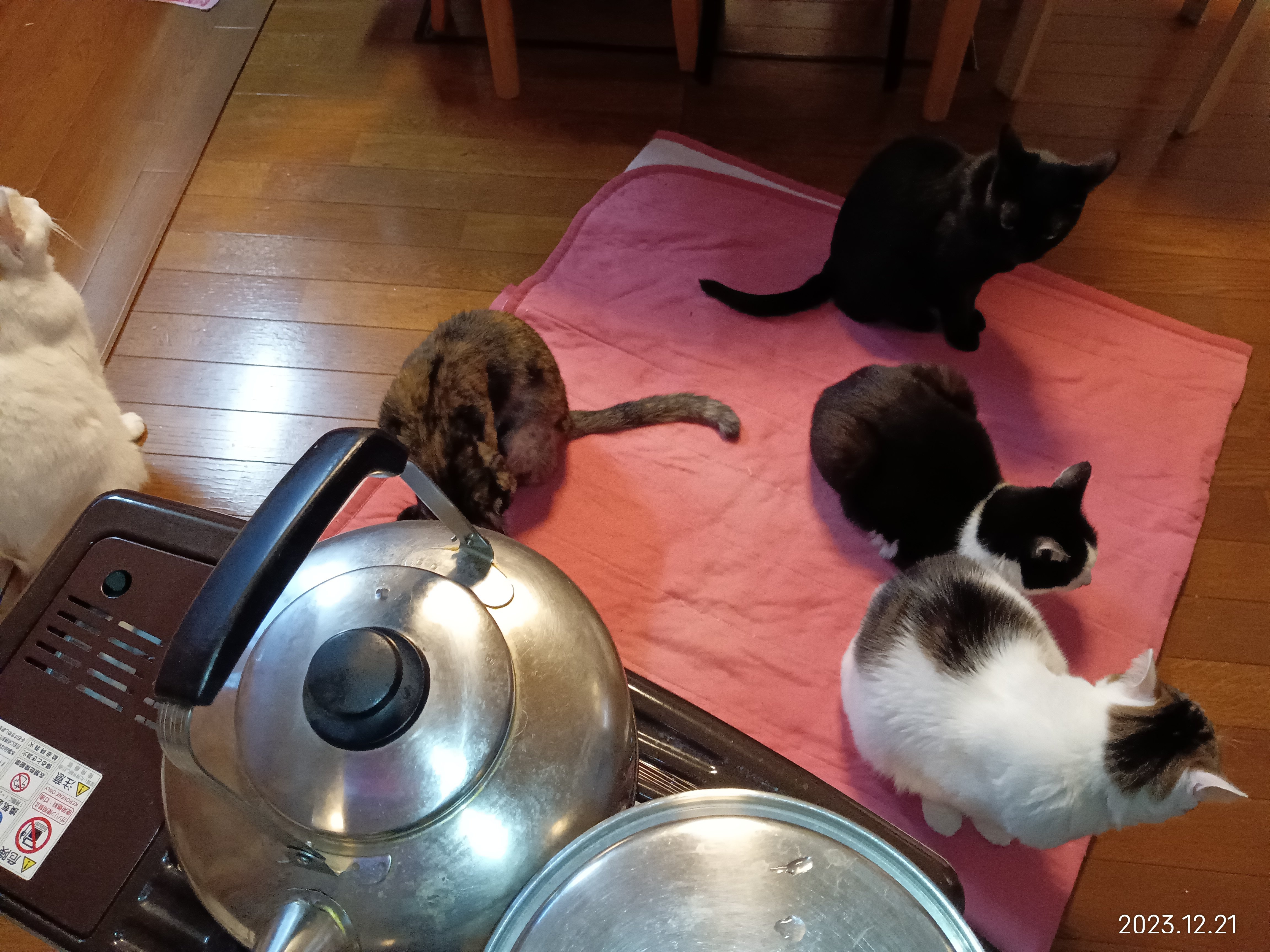 下の写真は、キッチンにある石油ストーブの前で温まっている、最近の猫たちの様子です。
