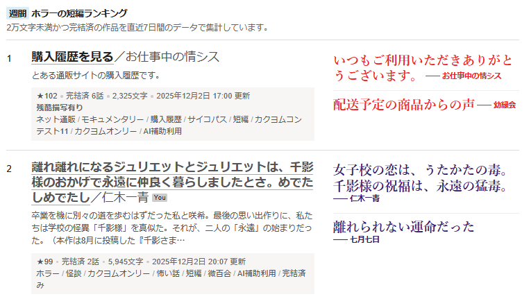 新作が週間ホラー短編ランキング2位になりました【ご報告とお礼】