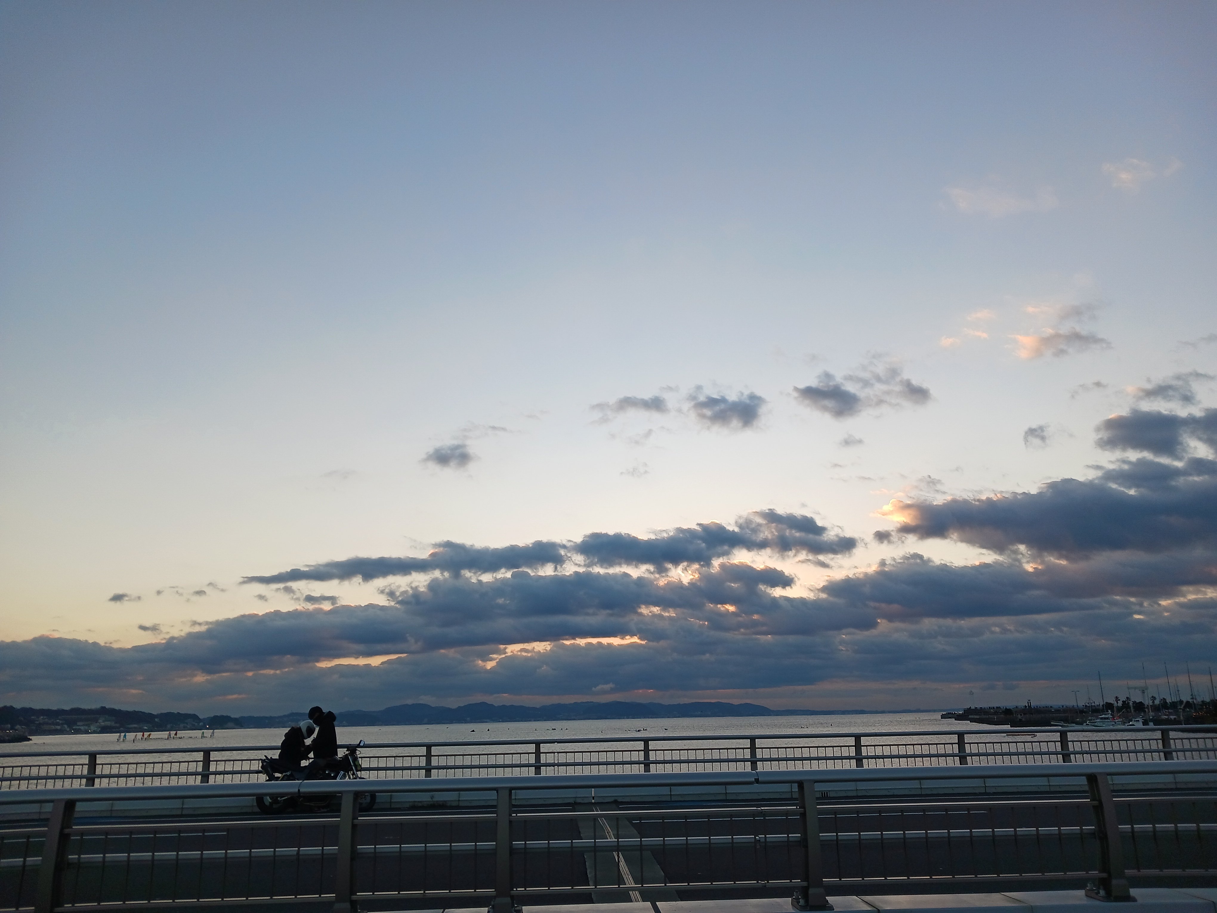 これ、夕暮れのグラデーションにバイクのシルエットが溶け込む、映画のワンシーンのような一枚。海辺の静けさが、慌ただしい心をそっとほどいてくれるようです。
