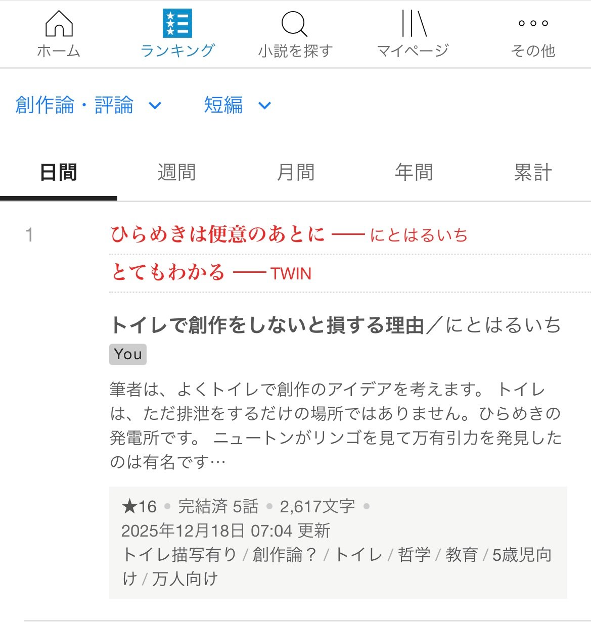 創作論ジャンル短編の日間ランキングで1位になってました……!