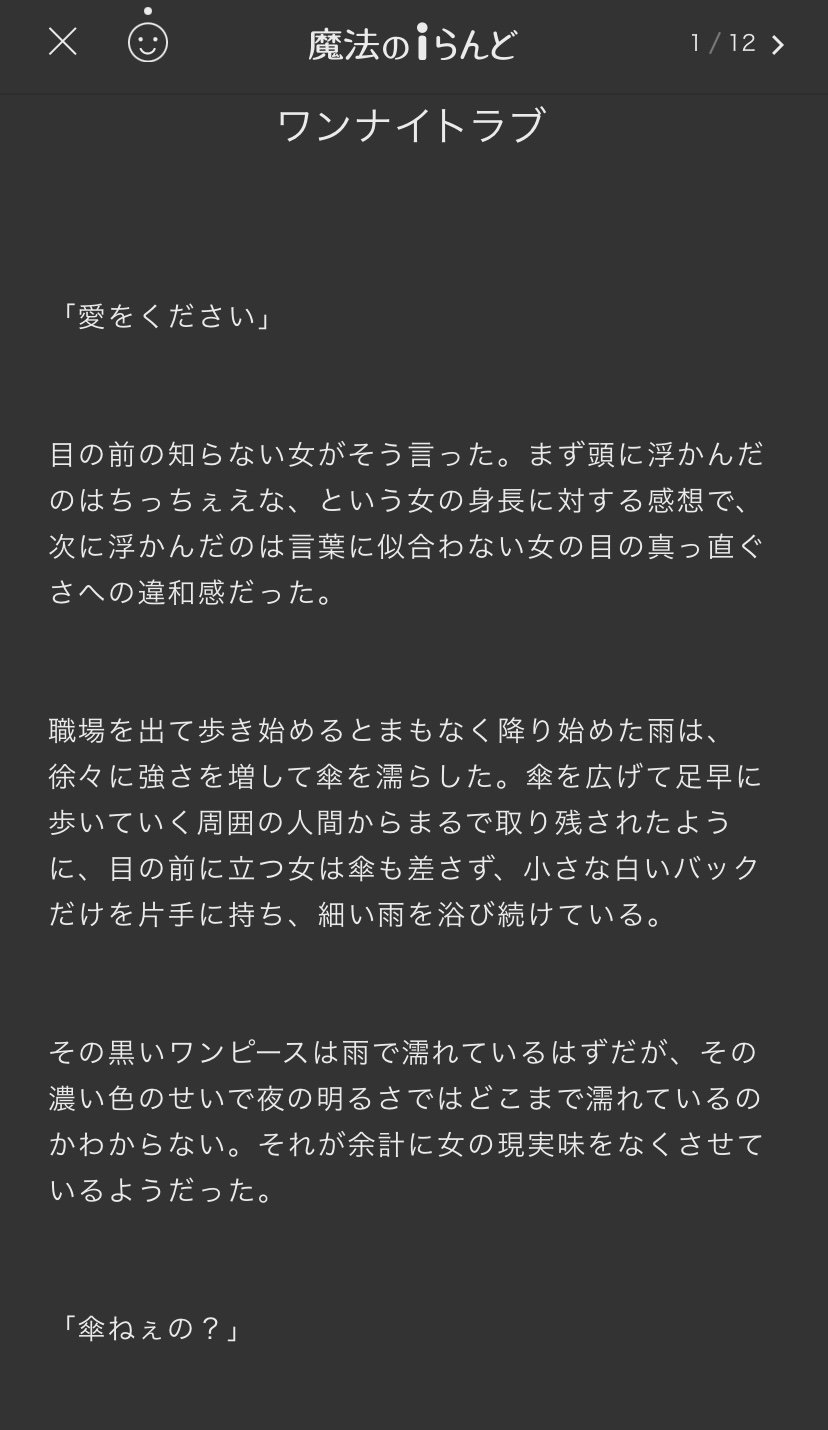 そのうちのひとつ、『ワンナイトラブ』にコメントをくださったy.kato-channelさま、ありがとうございます!連載中の作品にコメントをいただくのは初めてで(思い返せば短編ばかり書いているわたしの連載小説は本作と『16歳のモモコ』と『あやかしと巡り』しかなかった)、うれし涙が滲み出ました。そして何回読むんだというくらいにやにやしながら読み返しています。止まってわたし。