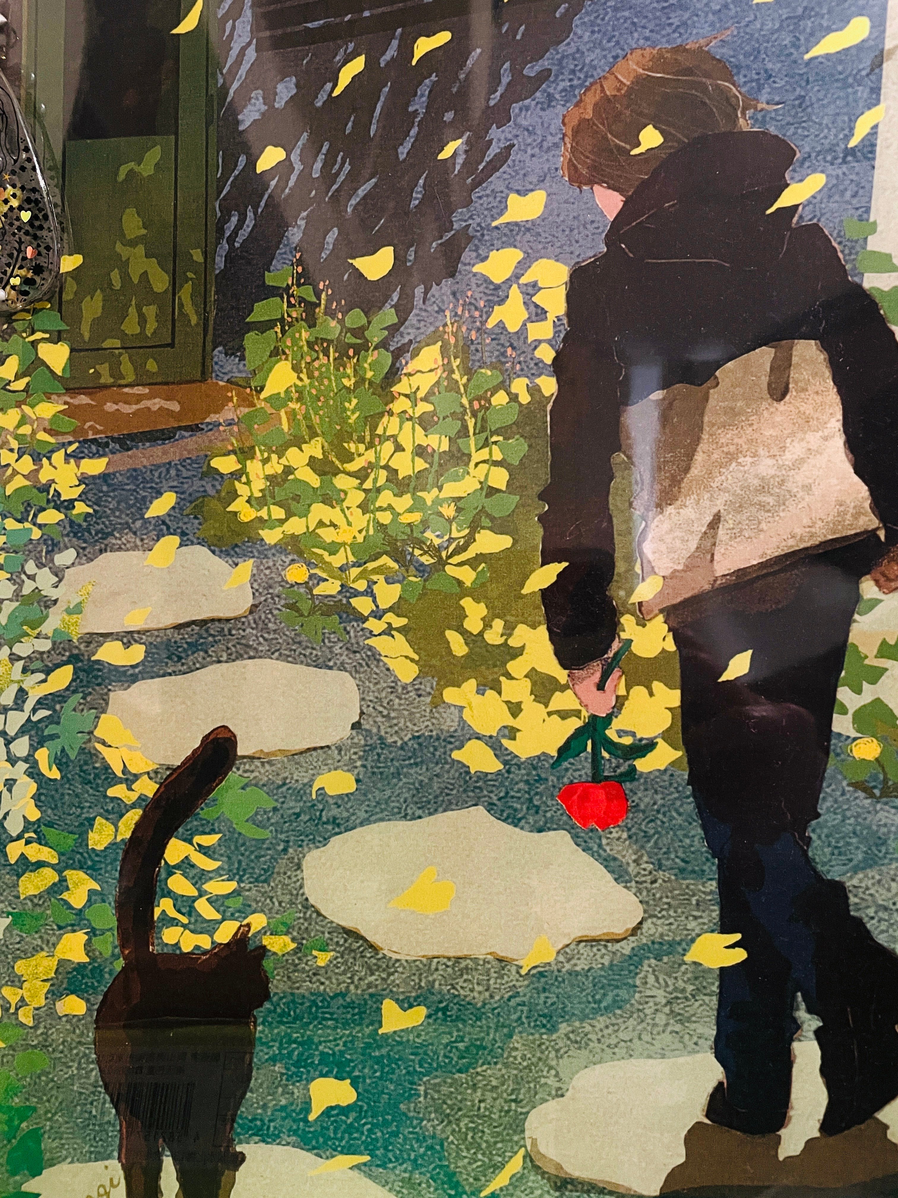 ふわりと舞う黄色の葉と猫、そして女性の後ろ姿。切なくも儚い光景が、情緒豊かに描かれています。