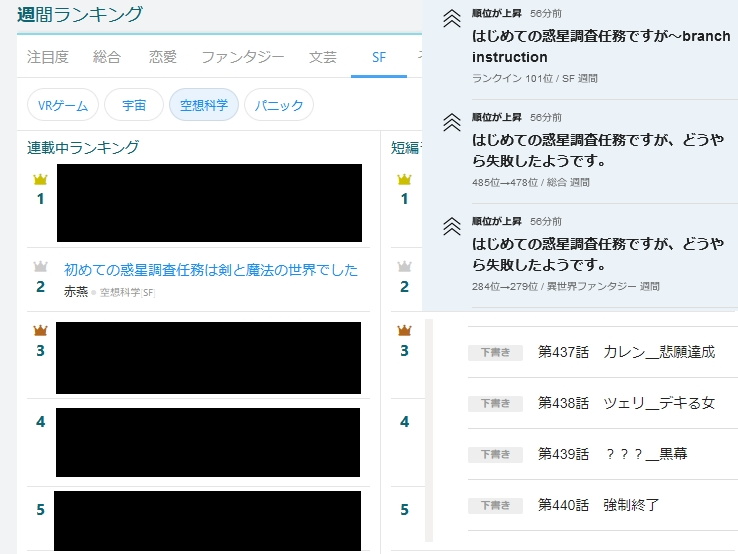 『小説家になろう』におきましても、SF(空想科学)のジャンルで二ヶ月ほどランクインできました。