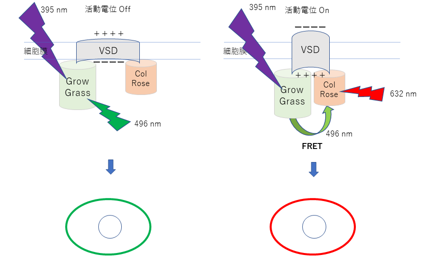 第14話でVoltがFRETによってニューロンの活動を視覚化する仕組み。