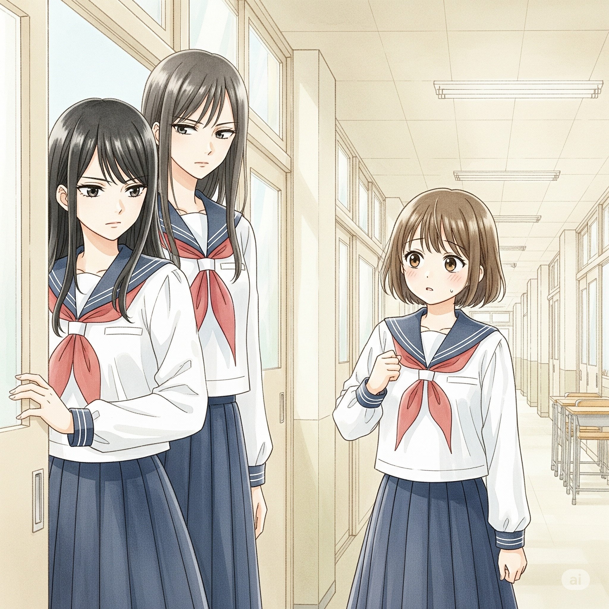 昼休みになり、三人で職員室のドアをノックしようとした時だった。中から二人の女子生徒が出てきた。田中美優さんと、田代環さんだ。二人は玲央の顔を見るなり、すっと表情を消し、値踏みするような、どこか冷たい視線を向けてきた。玲央は、その視線に気づき、心臓が小さく跳ねた。
