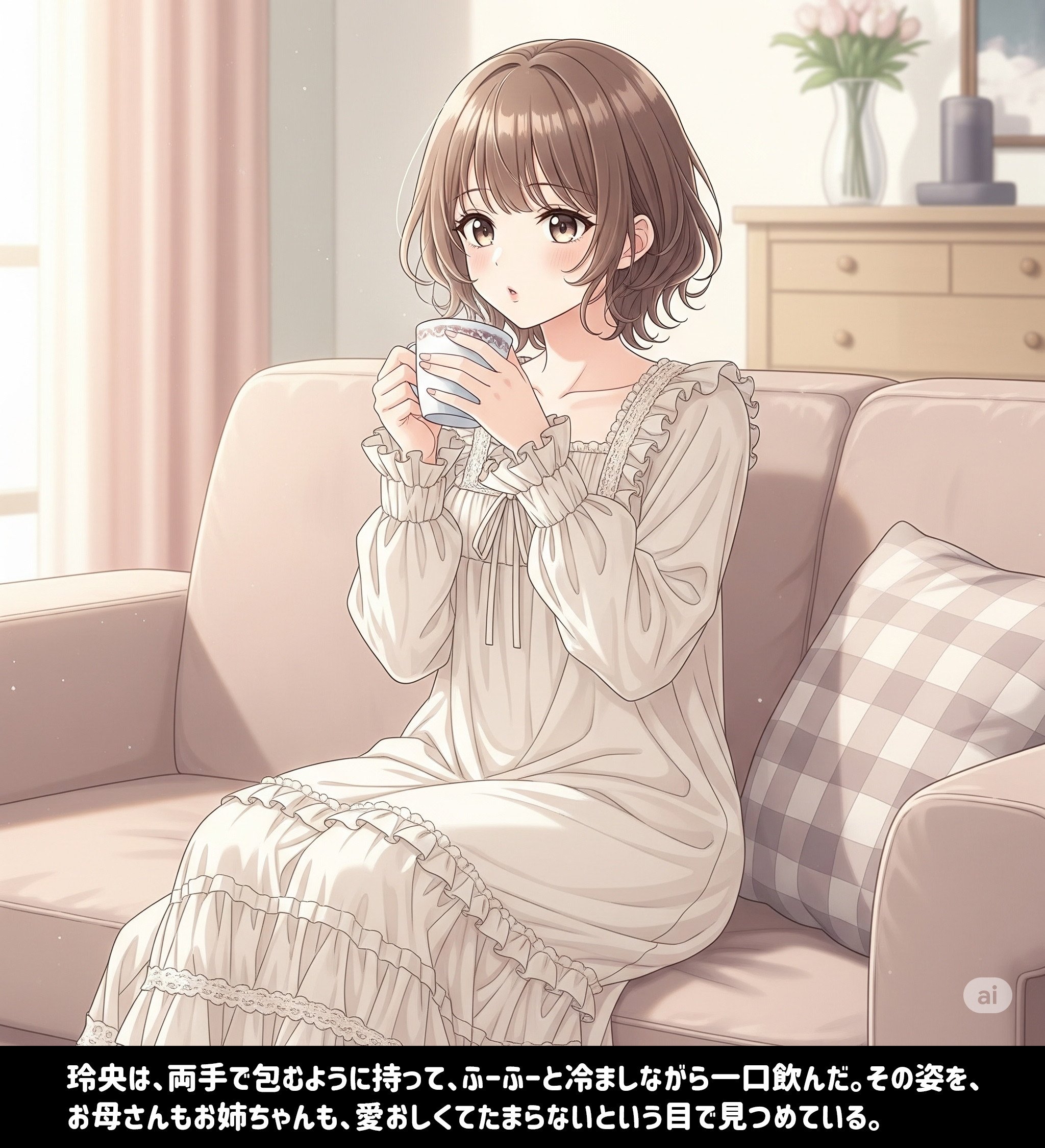 玲央は、お母さんが用意してくれた温かいホットミルクのカップを、両手で包むように持って、ふーふーと冷ましながら一口飲んだ。その姿を、お母さんもお姉ちゃんも、愛おしくてたまらないという目で見つめている。