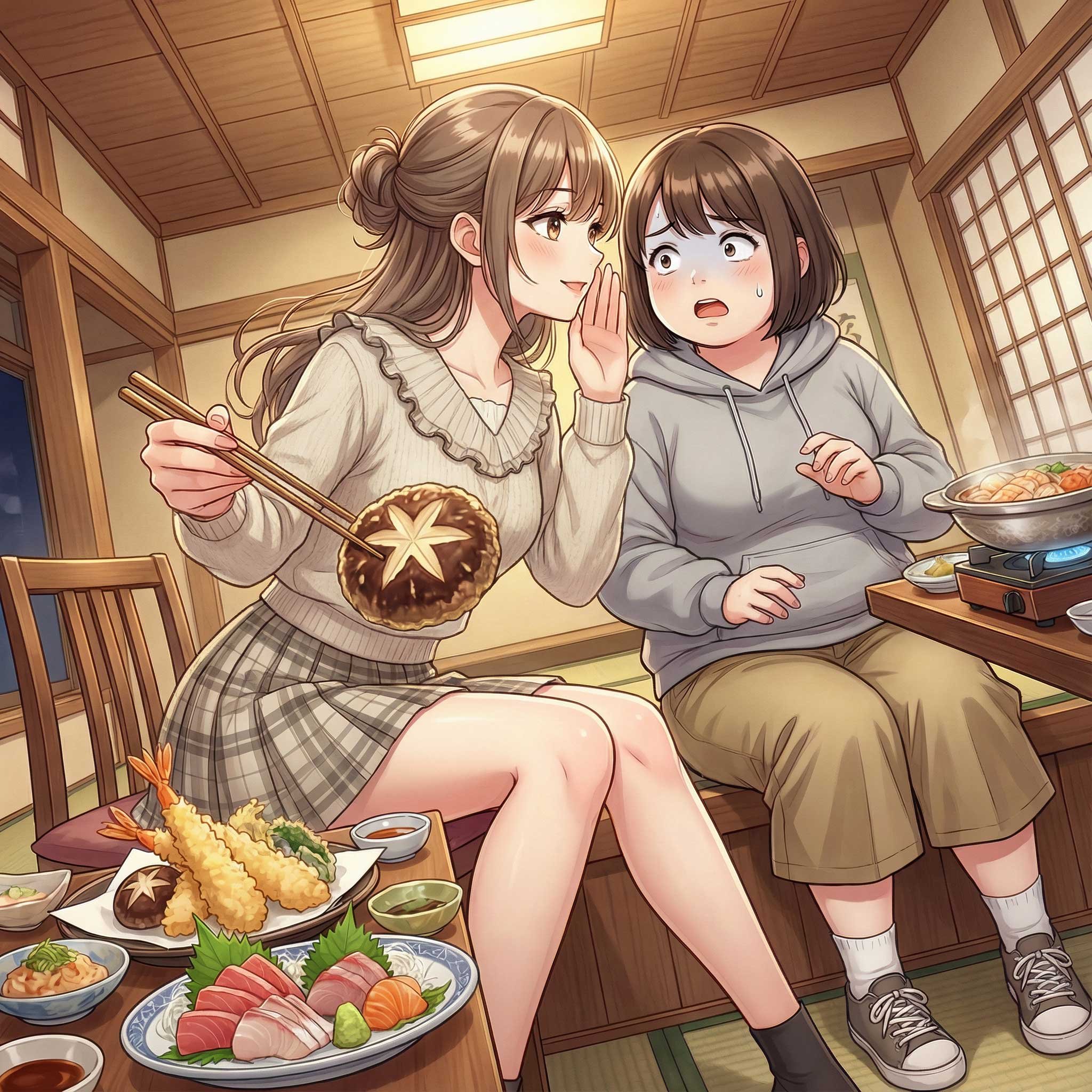 玲央は目を輝かせ、大きなシイタケの天ぷらを箸で摘み上げました。 そして、じっとそれを見つめると、隣のADに真顔で囁きました。