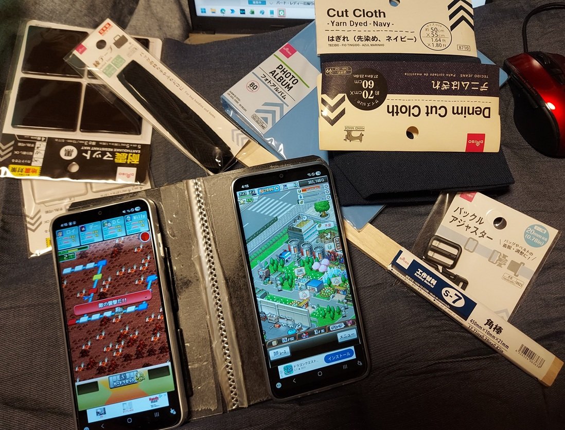 二台同時にプレイするのに便利なように、と、ニコイチのスマホケースを自作したが。