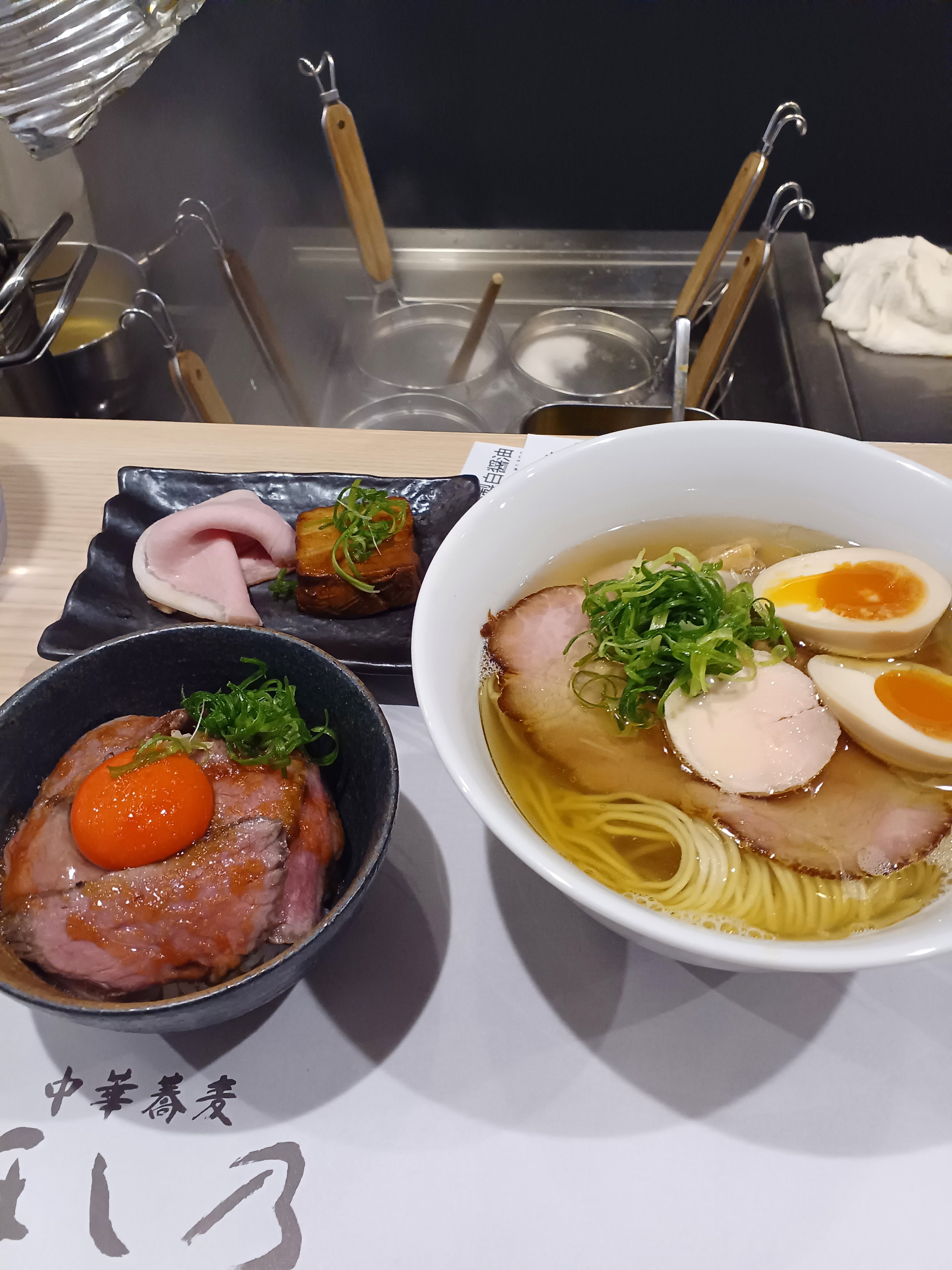 写真は、特製白醤油蕎麦と、和牛肉ごはん。