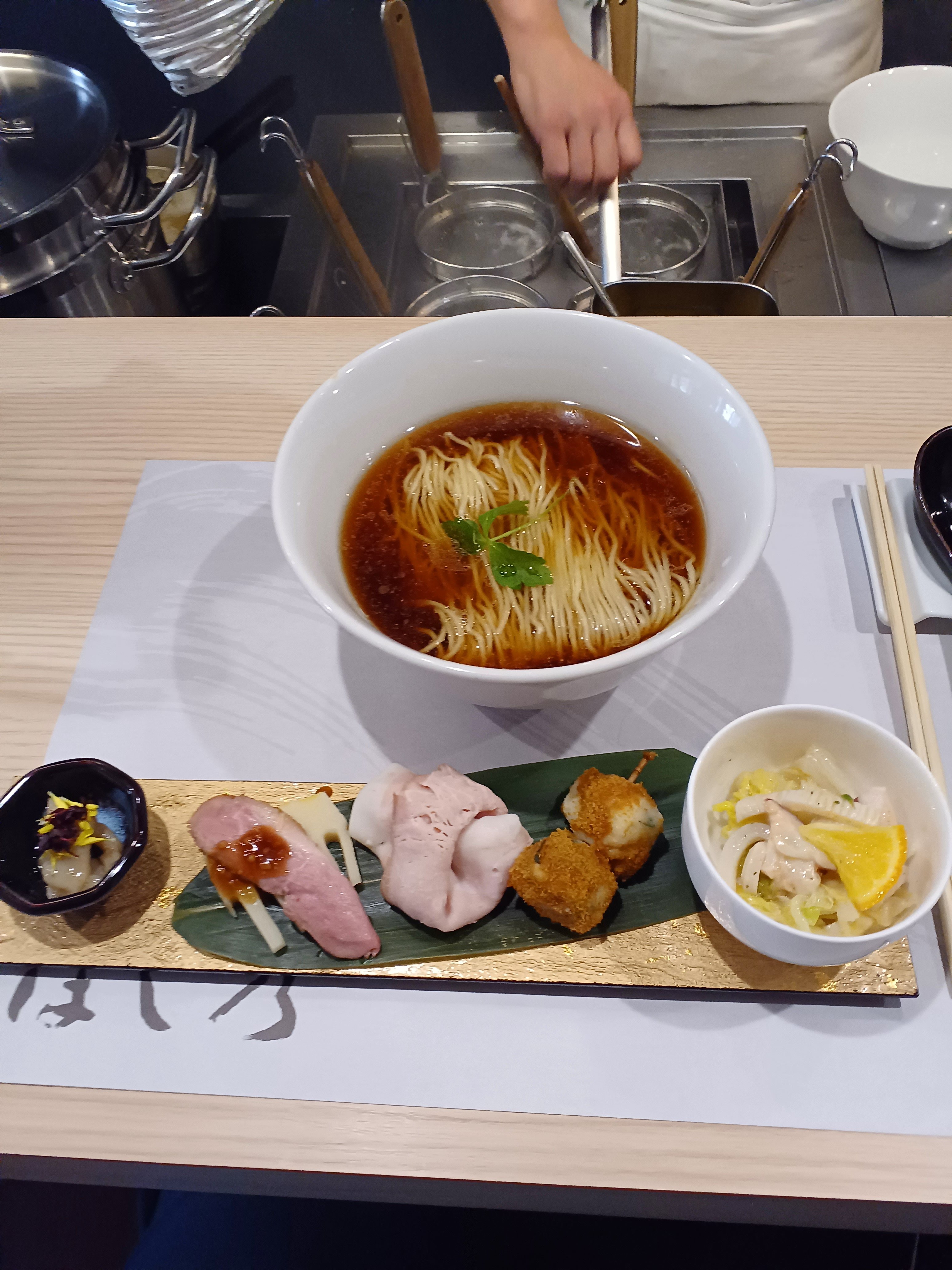 トッピングがイカとタコの春野菜のカルパッチョとか、鱧(はも)とサルデーニャポッタルガのピンチョスとか、鴨のバルサミコソースがけとか、なにかラーメンとは、違う未知の世界です。