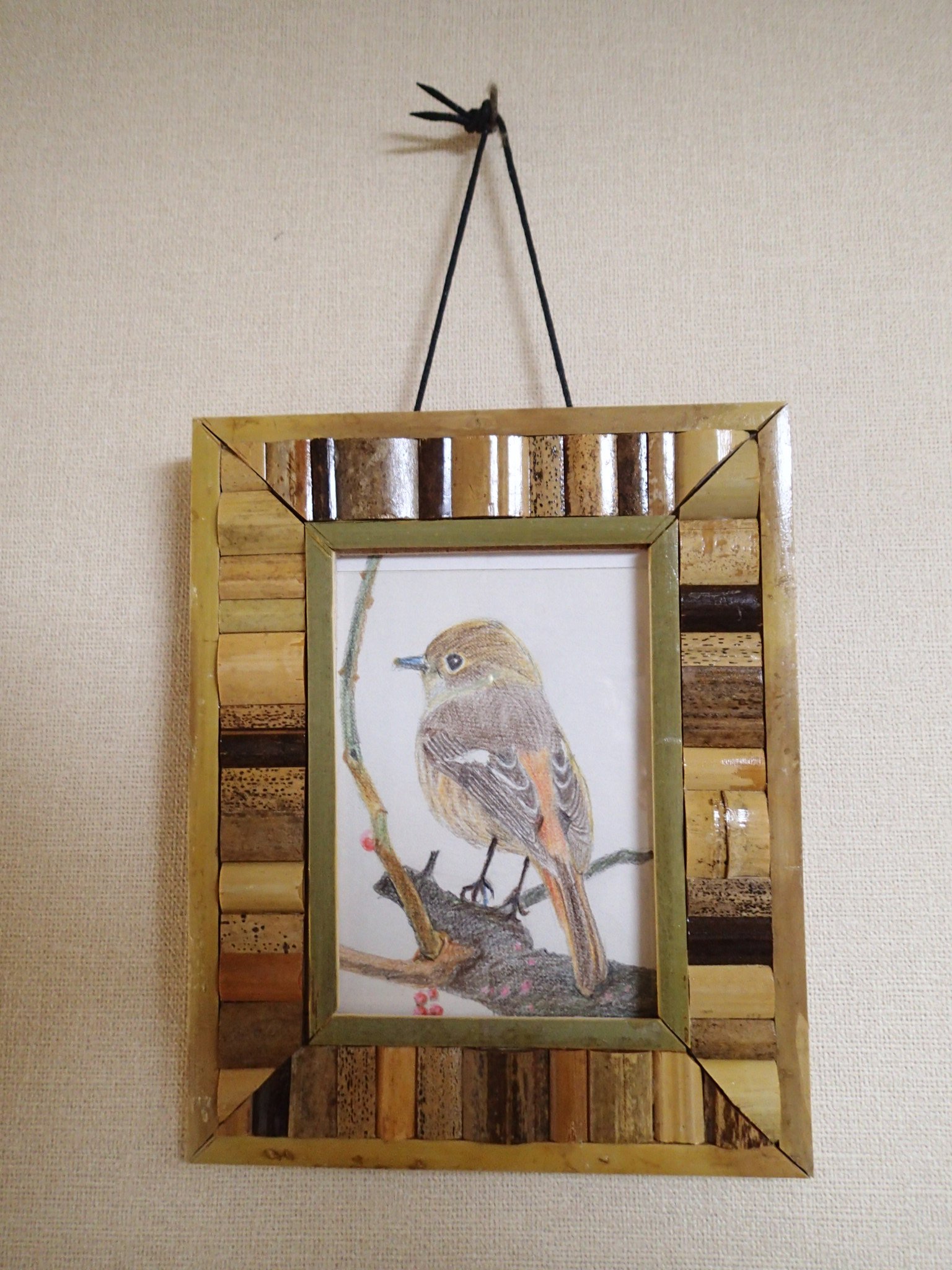 この時に偶然会った方が写真や絵を描くのが御趣味だとかで、手作りの額と描かれた絵をいただきました。小鳥の絵でかわいいです。そして額は、竹を切って貼り付けて作られていて、手間がもの凄いものでした。すぐに飾りましたが、良いご趣味だと羨ましく、私もいつか、挑戦してみたいと思いました。