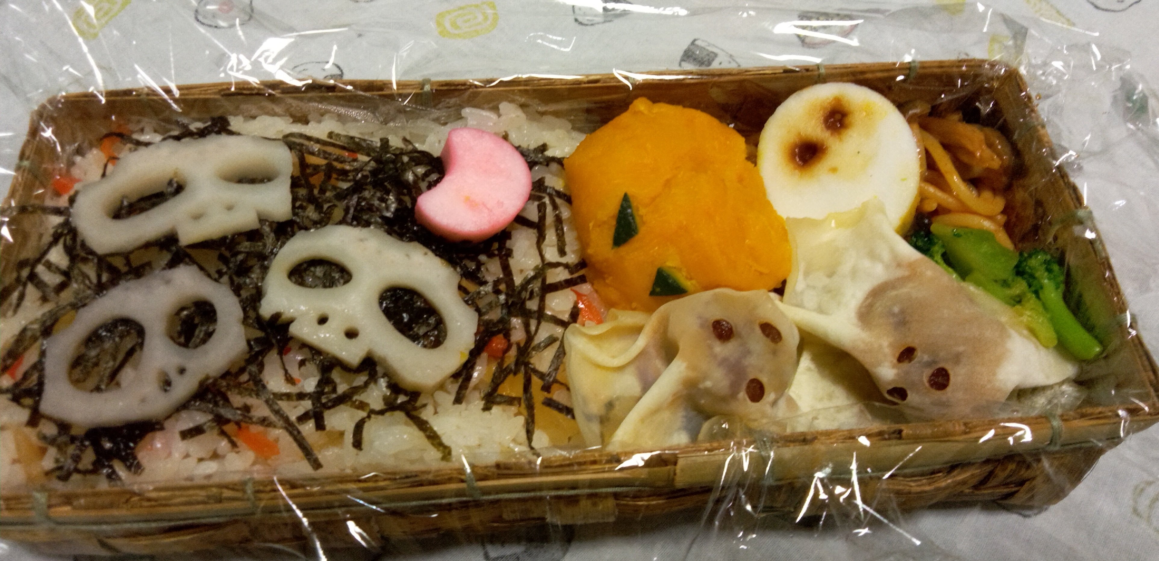 今日はハロウィンですね! 今晩のごはんも血の池とかハロウィン風ですが、お弁当もハロウィン仕様に。一昨年は土の下から這い出る死体と死体遺棄現場、去年は目が血走った女の霊と棺桶の中の腐乱死体。リアル系は怖いから嫌と不評なので、今年はポップにいきます。