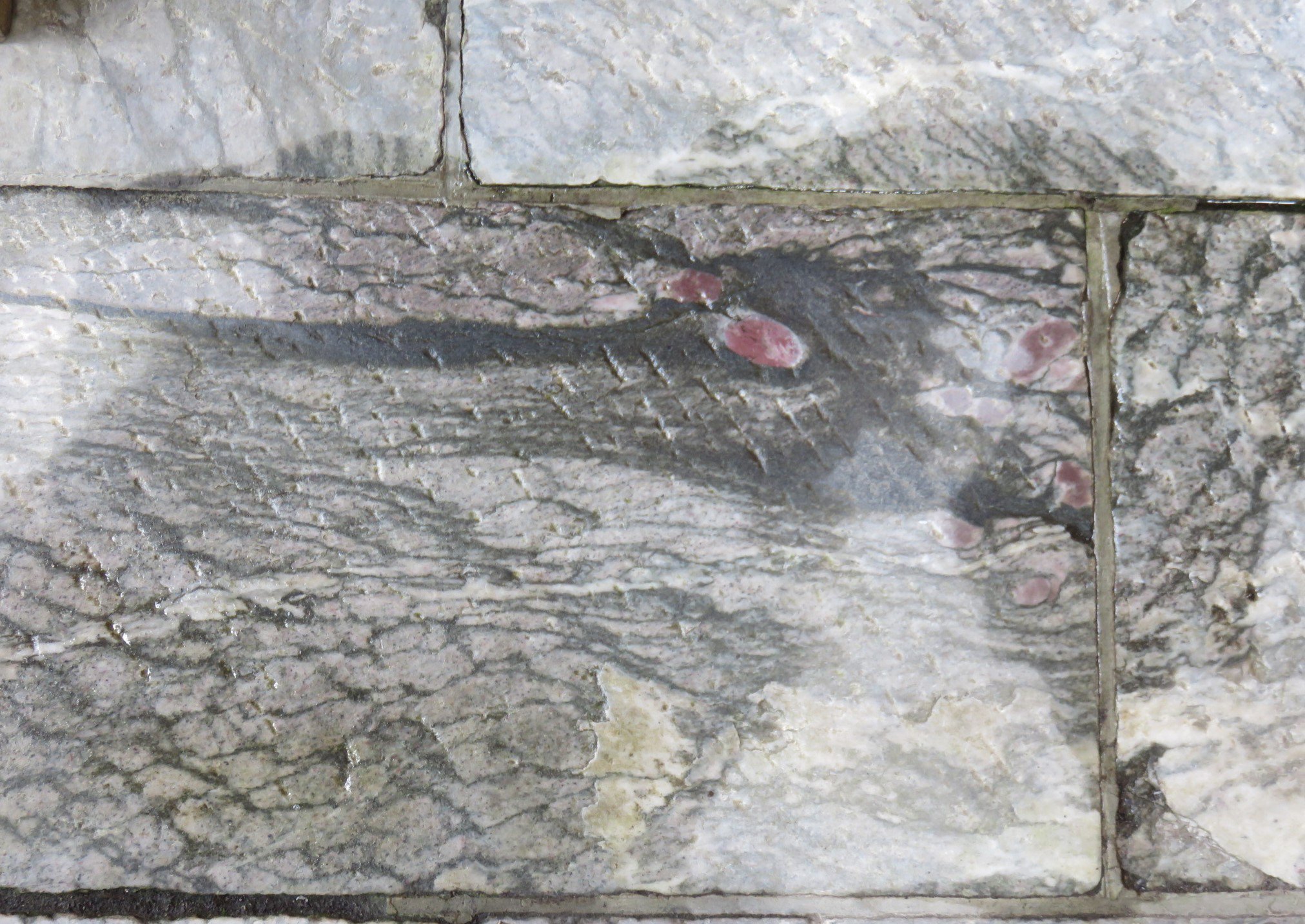 社務所の説明書きには『平成二十四年、この下の敷石に、その年の干支である『龍(辰)』が現れました。
