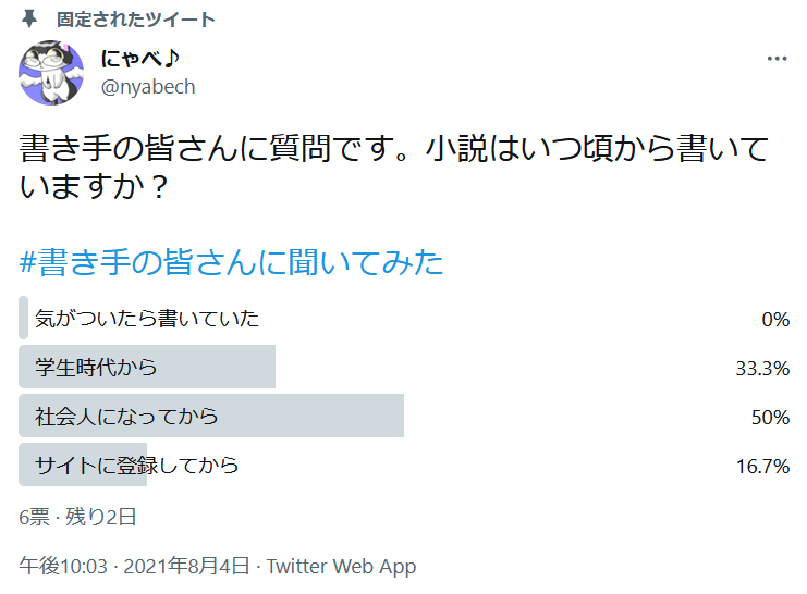 https://twitter.com/nyabech/status/1422906117307256836 今回のアンケートテーマは小説をいつから書いているかと言うものですね。カクヨムのような投稿サイトに投稿する人って、幼い頃から小説を書いている人ばかりだと思っていたんですよ。そうしたら最初は読み専だった人が作品に触れていく内に書きたくなって書き始めたって人もいるのを知って、創作に年齢は関係ないんだなあって思いました。