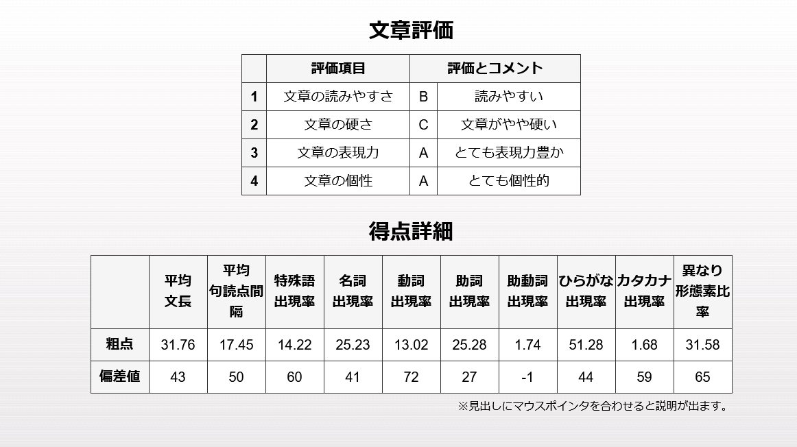 診断する文章によって結果がブレるので、もっと良い評価の文章もあるのかも知れません。でもまぁこの評価を出せただけで満足ですヨ。