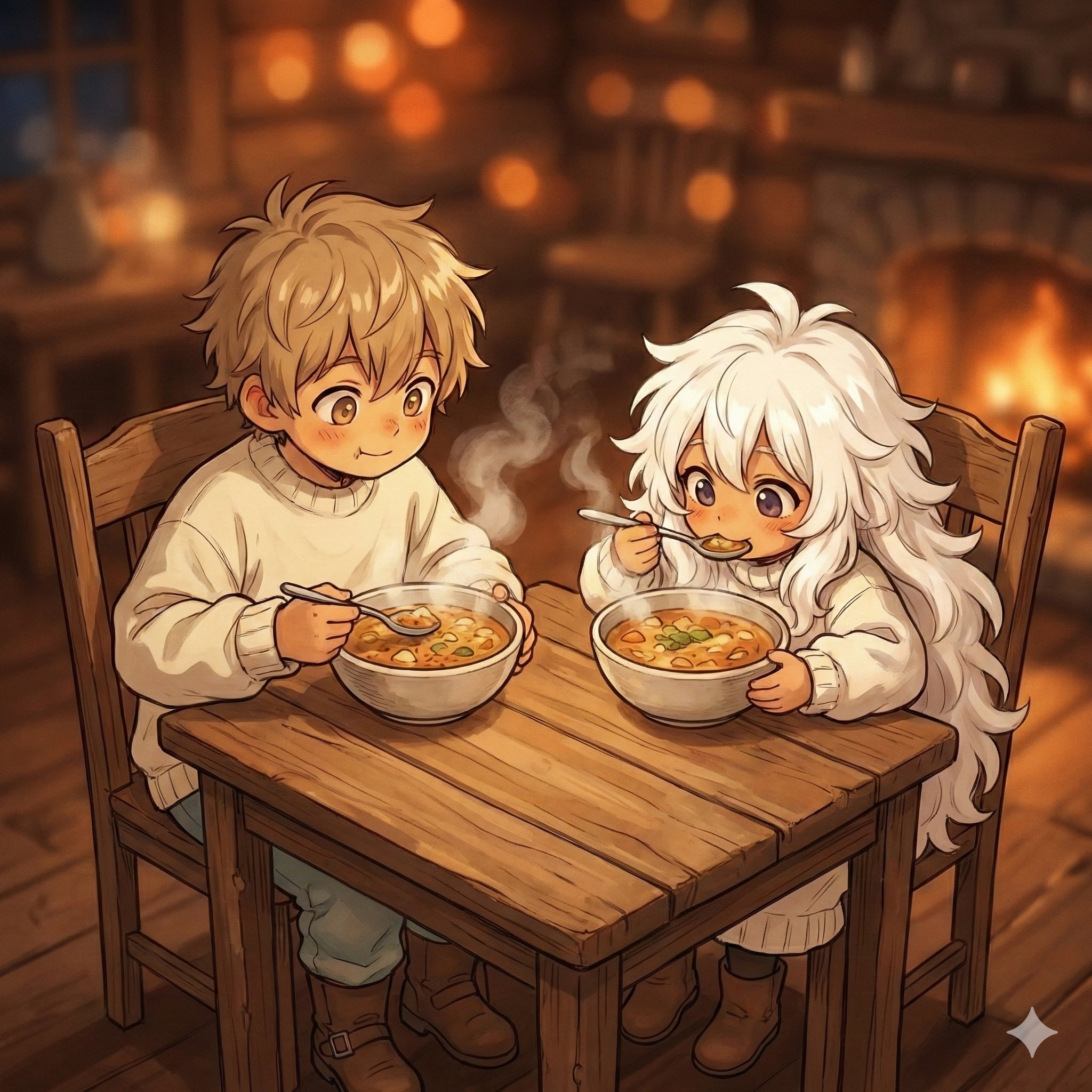 添付画像は、思い出の街のお爺さんの家でスープを食べるチルチルミチルです。