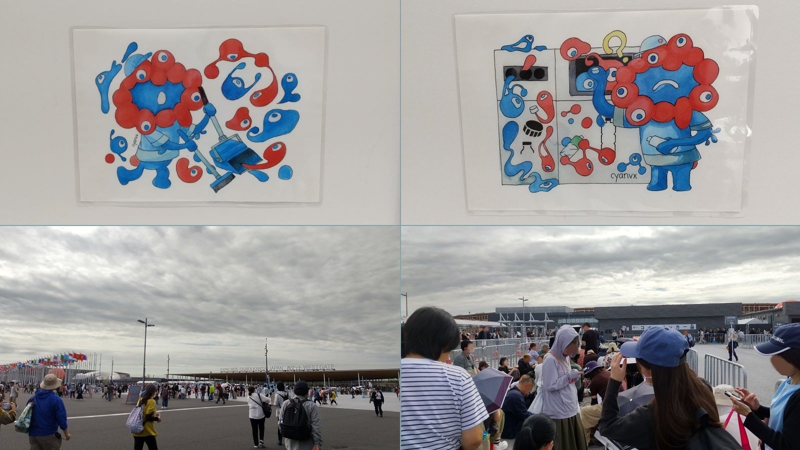 写真上:トイレのある建物に貼ってあったミャクミャク様の注意書きイラスト。