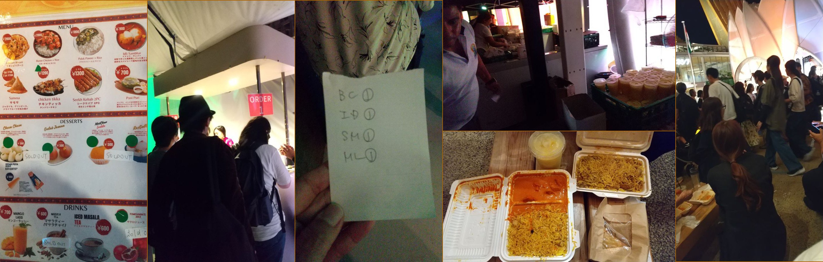 写真5枚目:大屋根リングのベンチで開いたインド料理。ビリヤニめっちゃ量が多い……