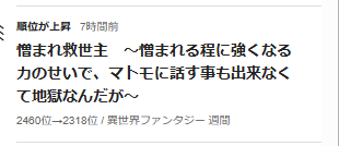 Web総PV20万PV突破の異世界転移ファンタジー、『憎まれ救世主』、順位上昇です。