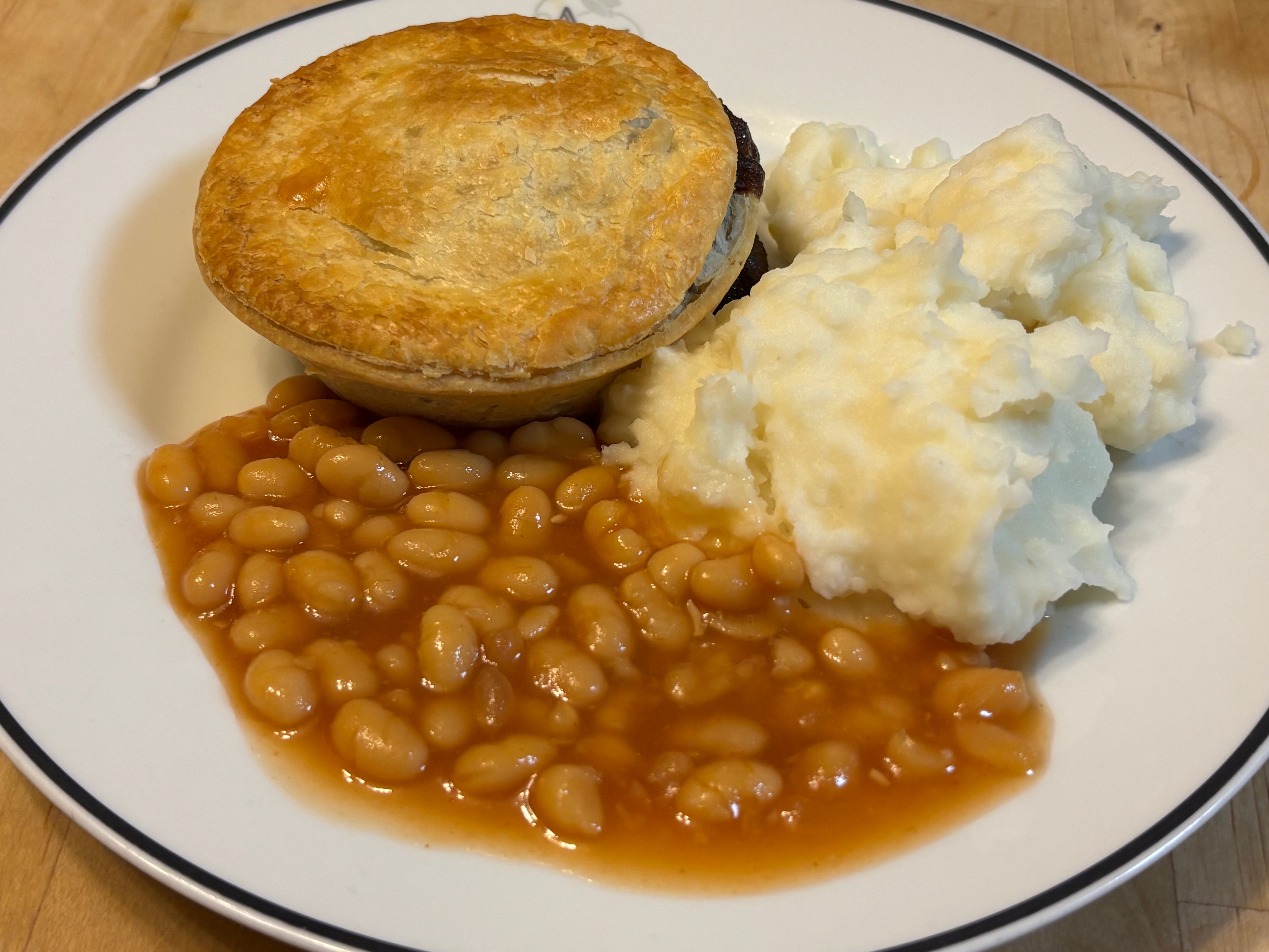 ところで写真はあかつきりおまさんの英国飯エッセイでリプさせてもらったパイにもビーンズの写真です。ビーフパイ、マッシュドポテト、豆。味は美味しいけど野菜不足は否めません。