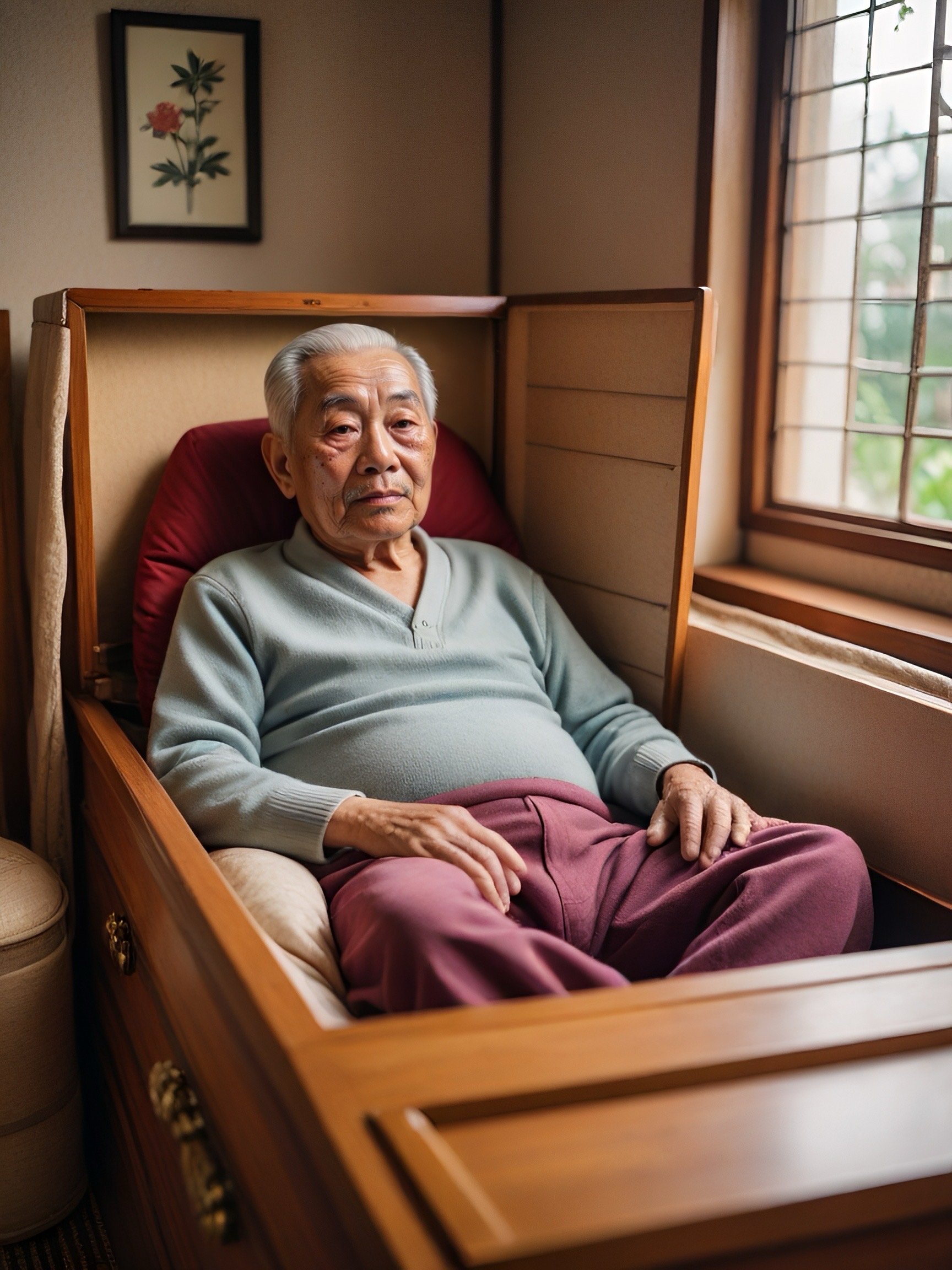 お気に入りの棺桶をソファ代わりにくつろぐ田中何某氏(終活六年目)。