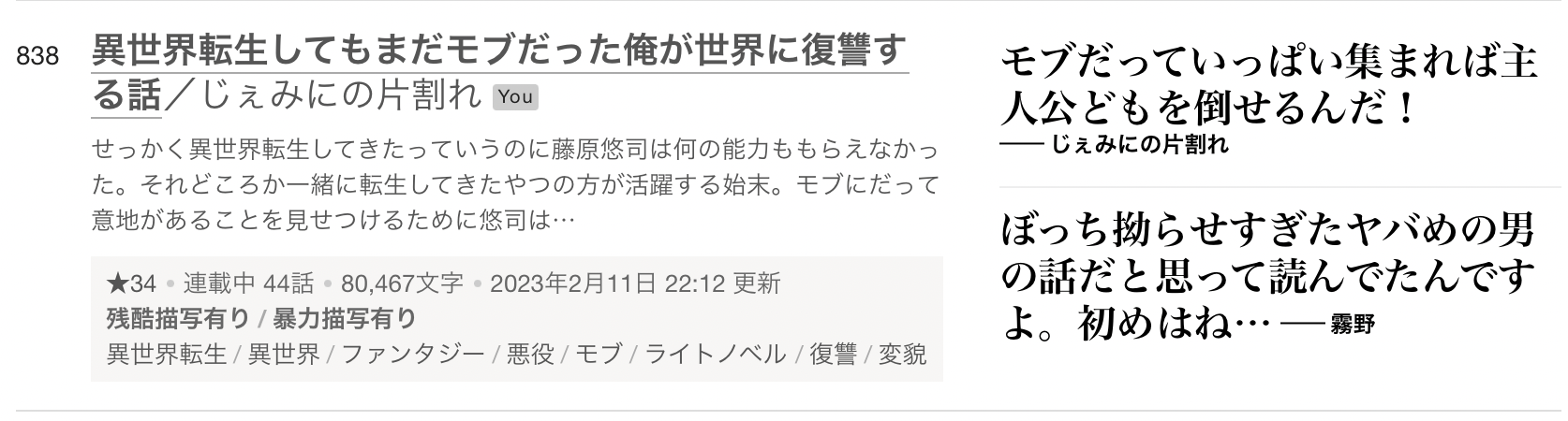 『異世界転生してもまだモブだった俺が世界に復讐する話』が週間ランキングで838位になりました!