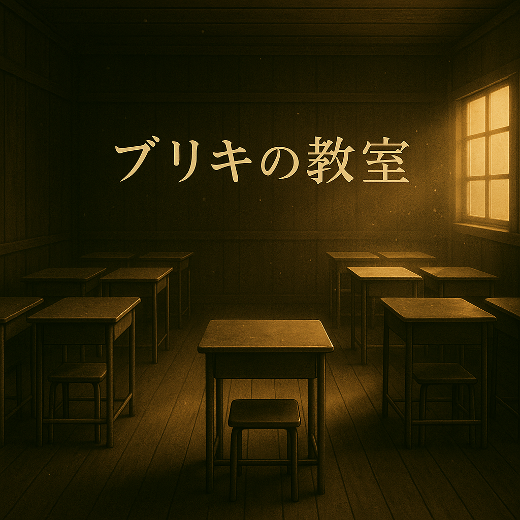 埃をかぶったブリキ机が並ぶ、廃校の教室。