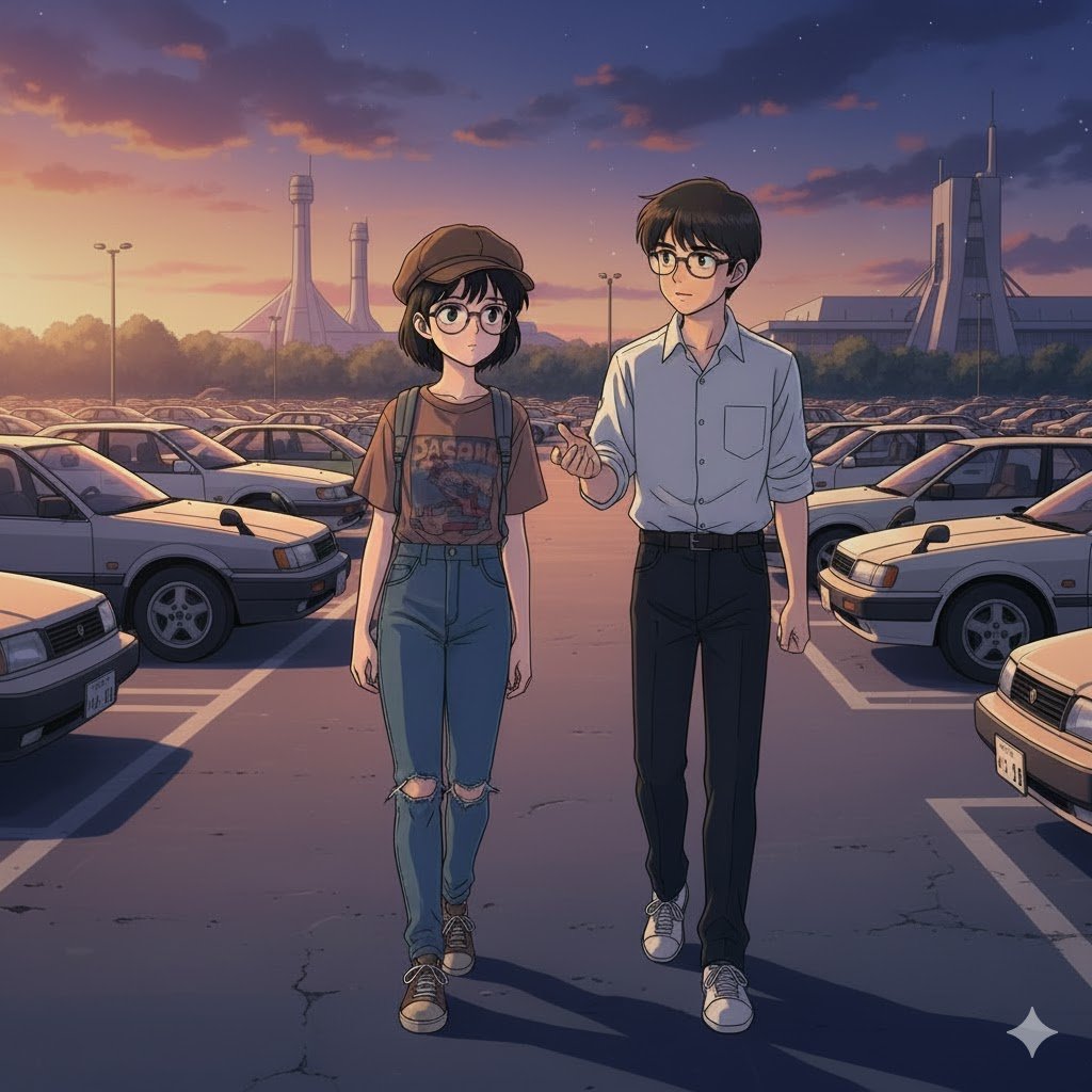 Geminiさんに描いてもらいました。シャツはズボンにイン!車のミラーはフェンダーミラー! でもよく見るとドアミラーの車もあるな…