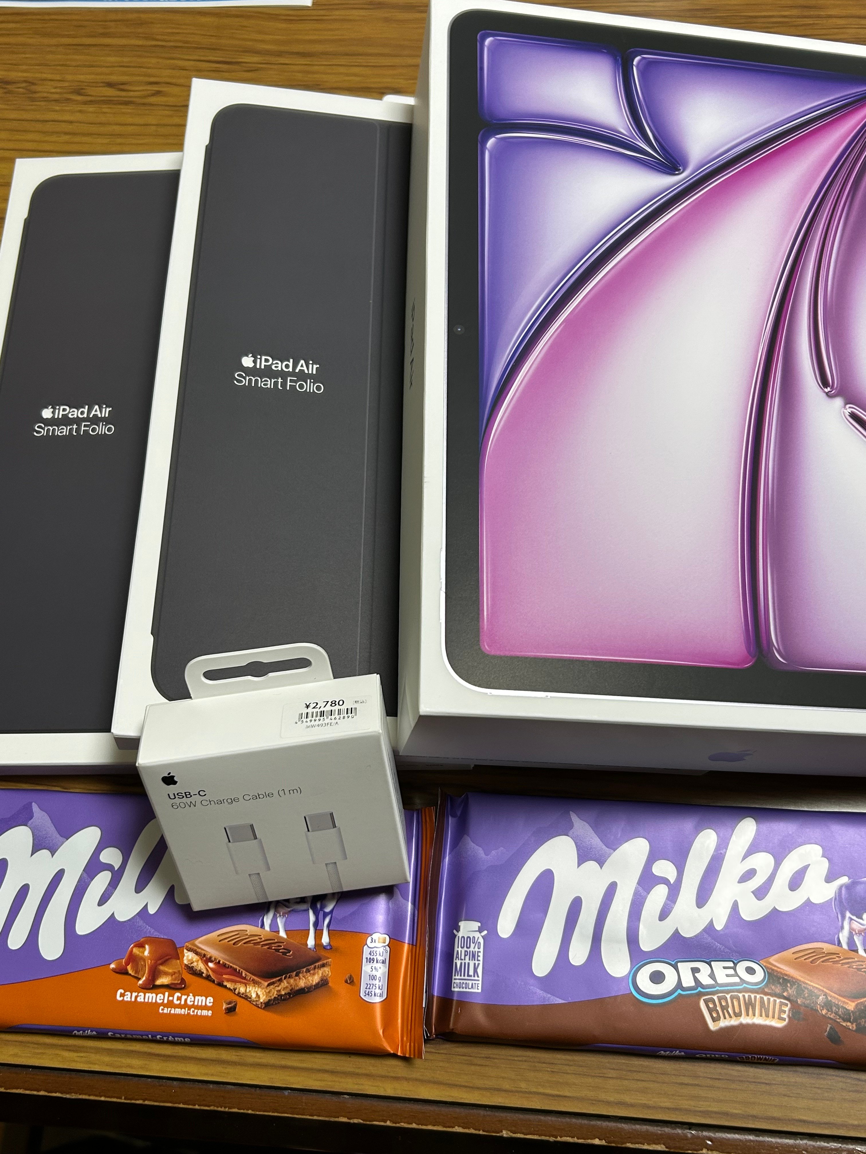 iPad Airと、カバーと、カバー予備と、ケーブル予備。
