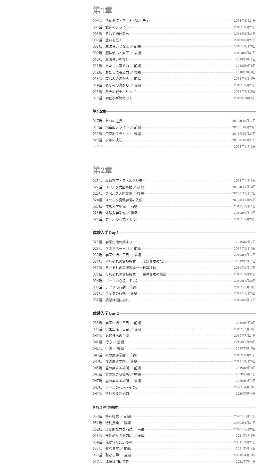 載せた画像を見ると分かるのですが、第2章全体を小見出しで区切ってみました。やってみるとあら不思議、区切ったほとんどが第1章より話数が少ないではありませんか!