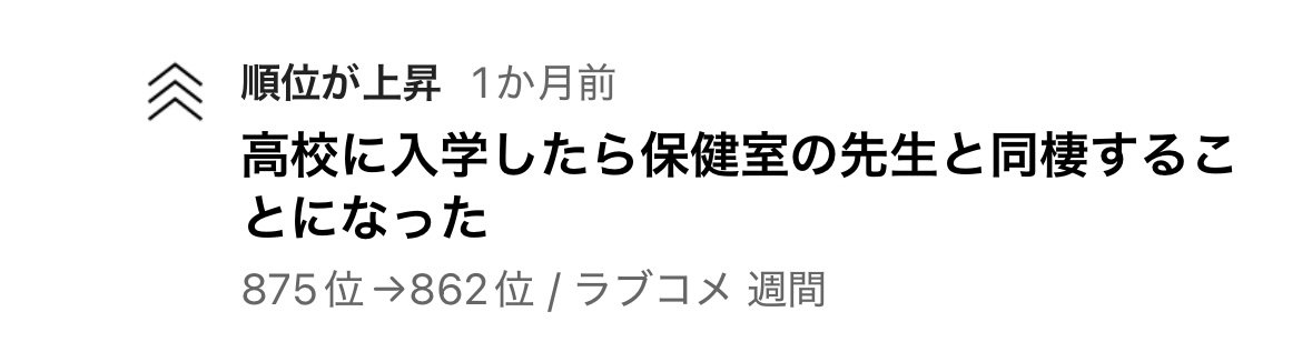 少し時間が経ってしまったのですが、私の「高校に入学したら保健室の先生と同棲することになった」がラブコメジャンルでの週刊ランキング1000位内に入りました!