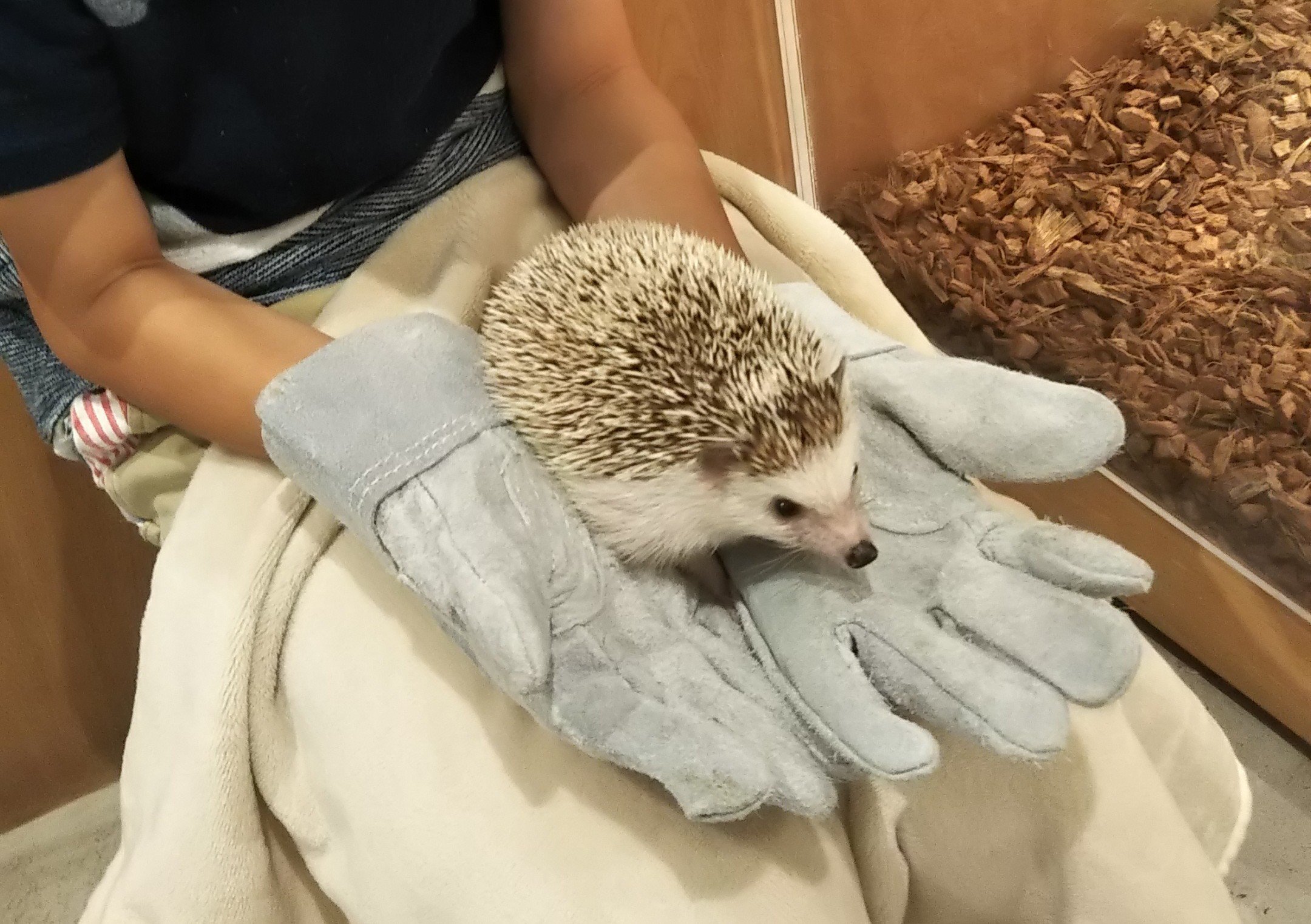 写真はハリネズミの抱っこ体験。息子が抱っこした姿を、娘はお父さんの陰から見守ってました。
