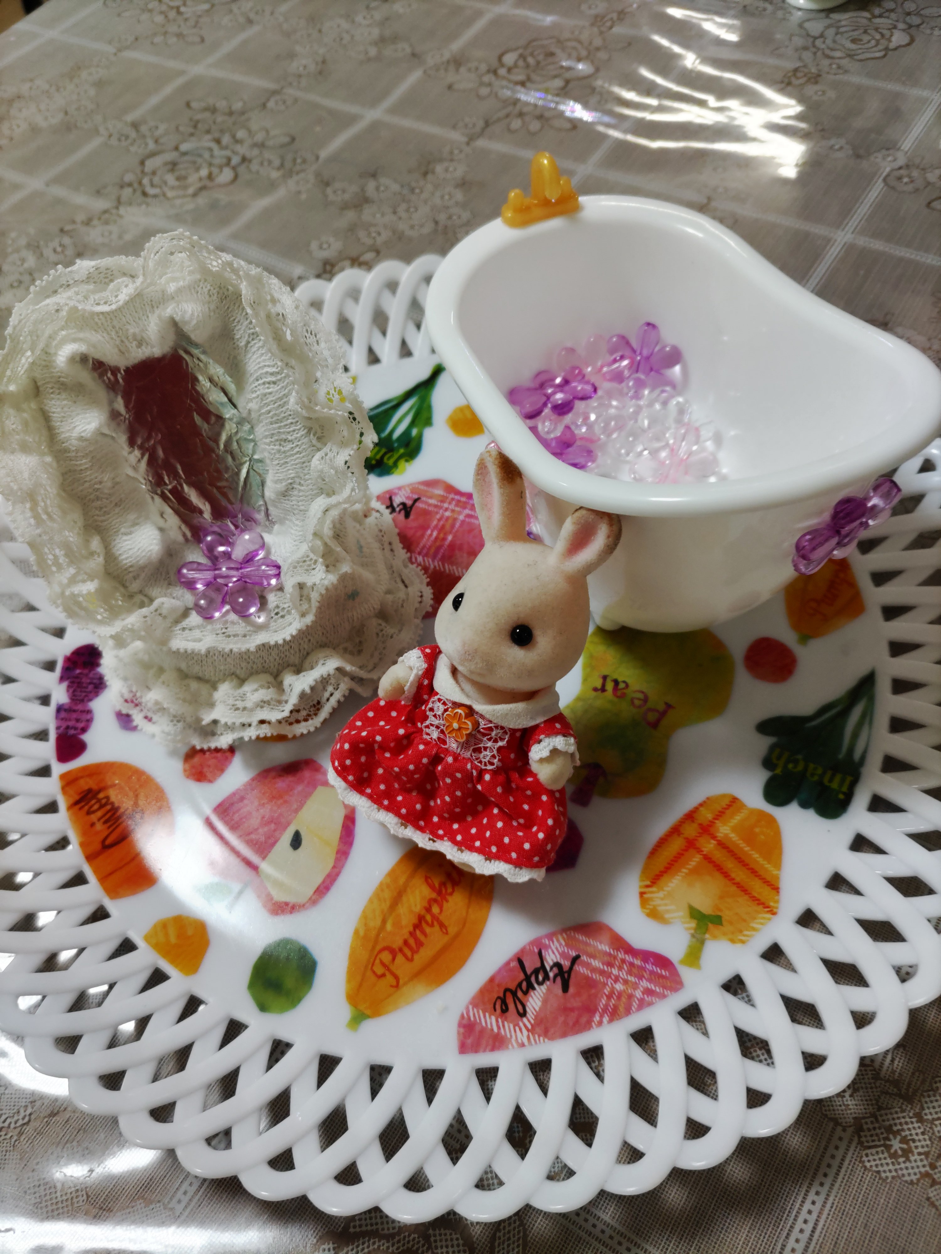 ラッピング用に売ってたバスタブにビーズを貼り付け、可愛いお皿に載せたらバスルームの完成💕