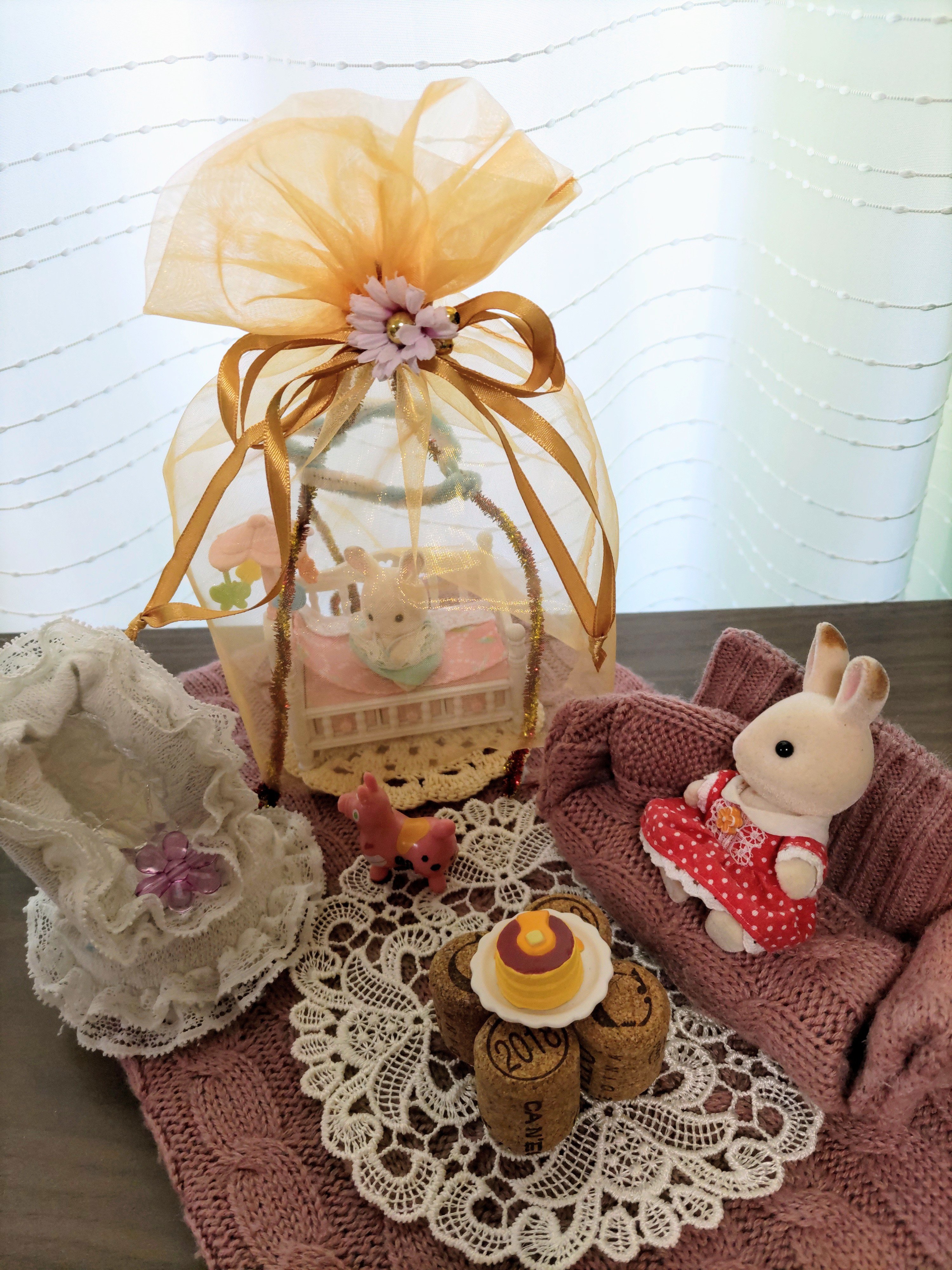 娘のリクエストで、ミニソファーとローテーブル(コルク栓)とベッドの天蓋を作成しました〜! (*´∀`*)