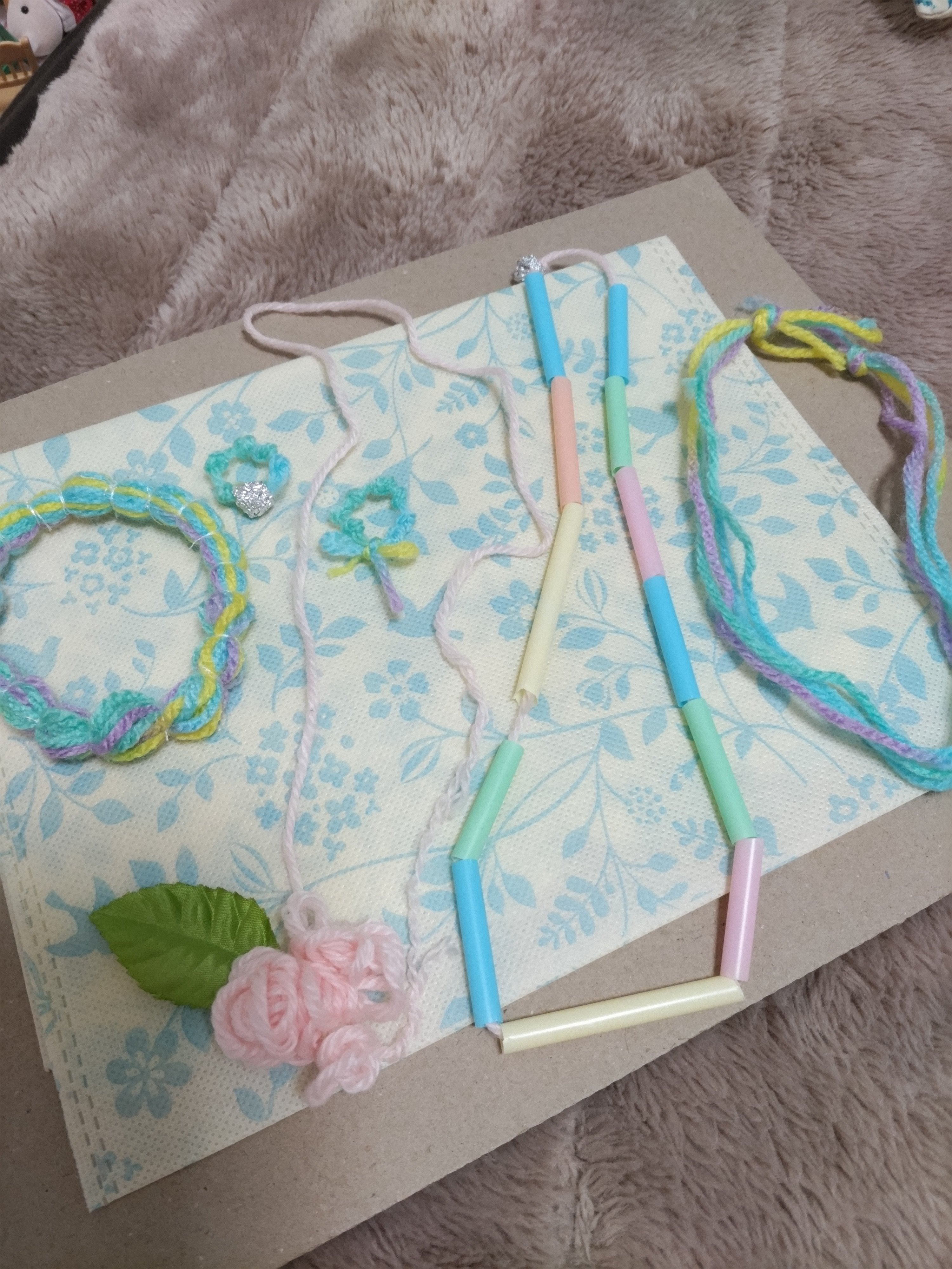 写真はユヅと作った毛糸のアクセサリーです。家にあるもので、何とかなるものですね。