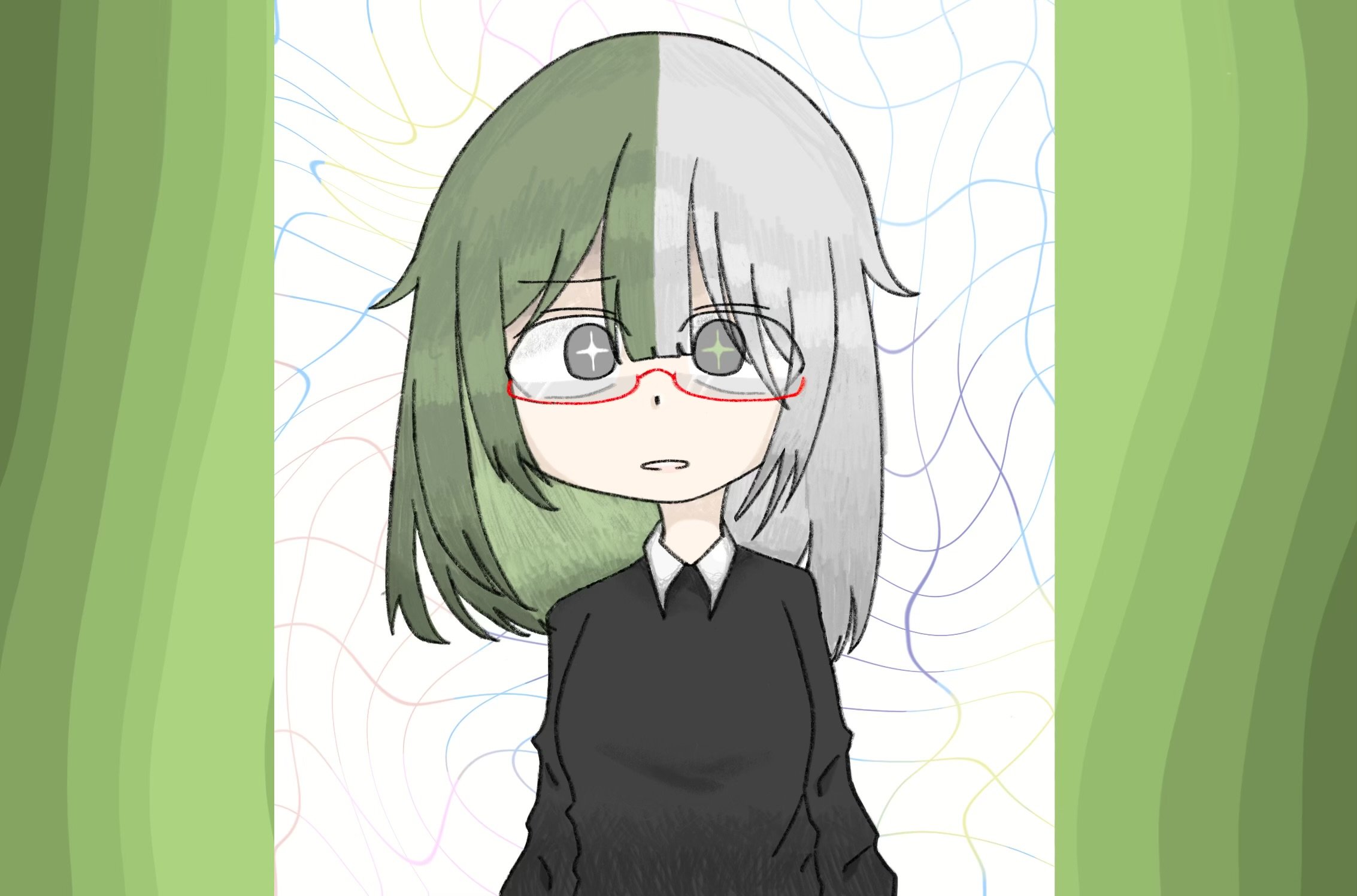 の主人公、廿楽千晴(つづらちはれ)の絵を描いて見ました。緑と白色の髪の毛が特徴のキャラクターです♫