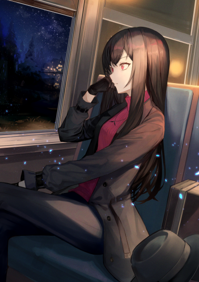 憂いの表情を浮かべ、車窓から景色を眺めるハルシネ