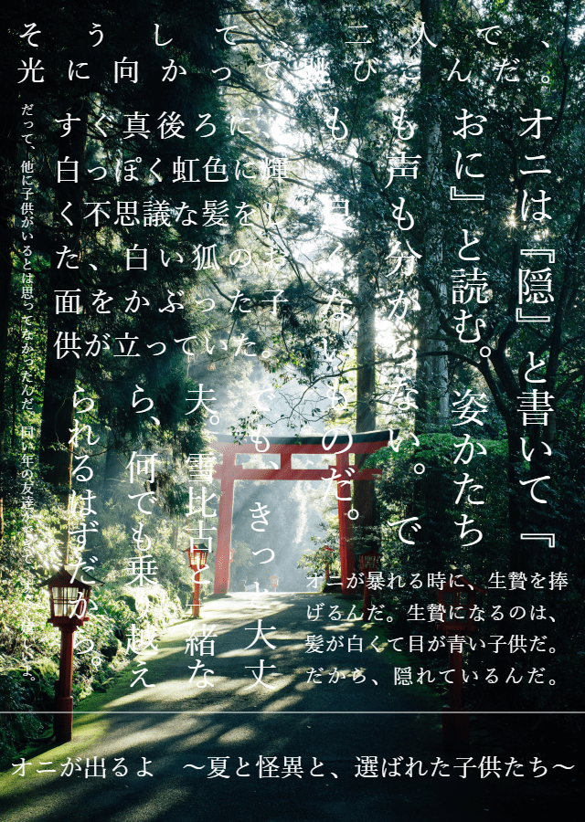 →改訂版はこちら:『オニが出るよ 〜夏と怪異と、選ばれた子供たち〜』