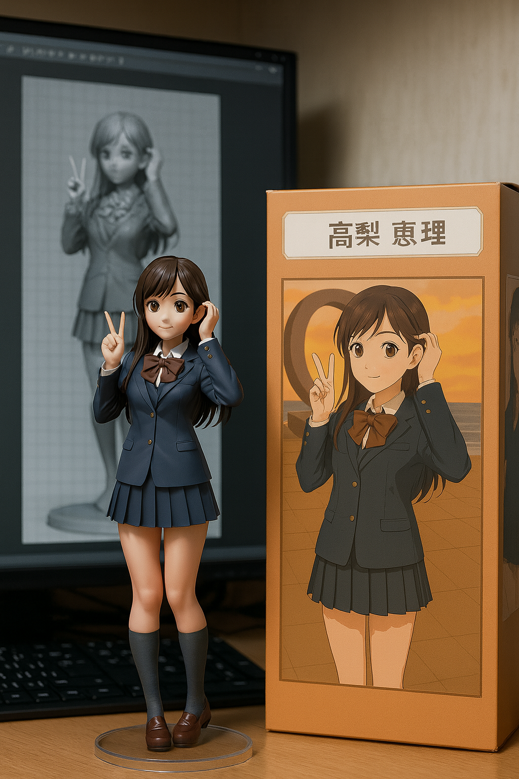 Create a 1/7 scale commercialized figurine of the characters in the picture, in a realistic style, in a real environment. The figurine is placed on a computer desk. The figurine has a round transparent acrylic base, with no text on the base. The content on the computer screen is a 3D modeling process of this figurine. Next to the computer screen is a toy packaging box, designed in a style reminiscent of high-quality collectible figures, printed with original artwork. The packaging features two-dimensional flat illustrations.